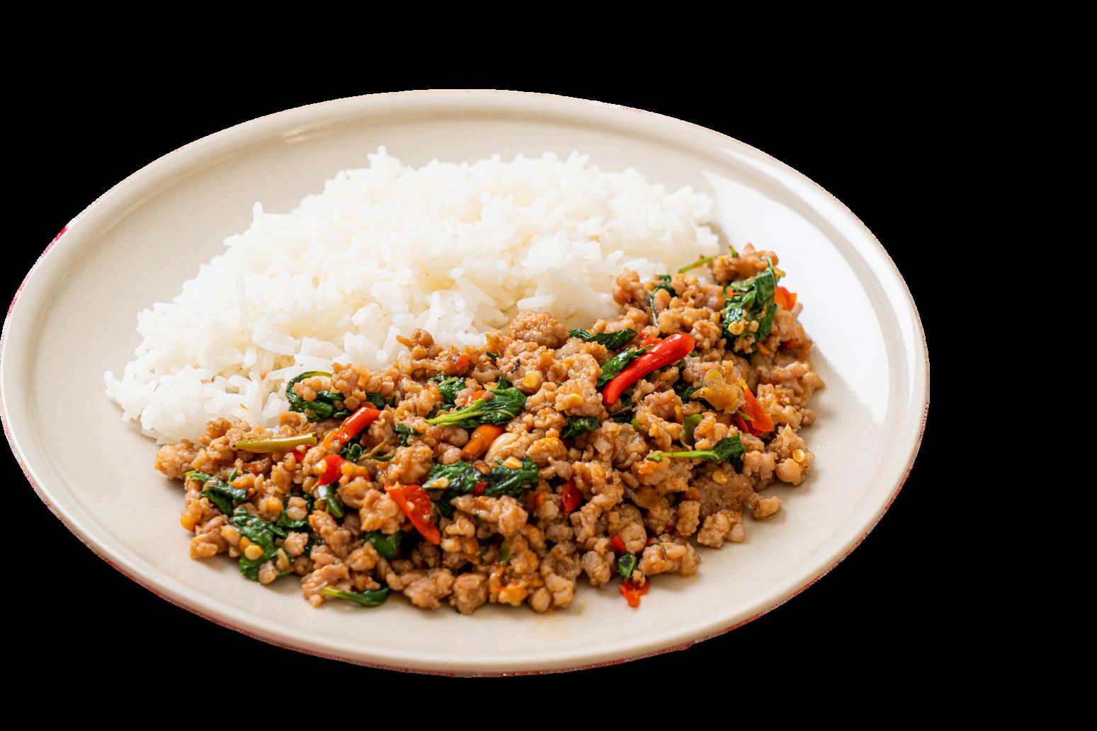 Choice of meat, egg, bell pepper, onion, basil and fr