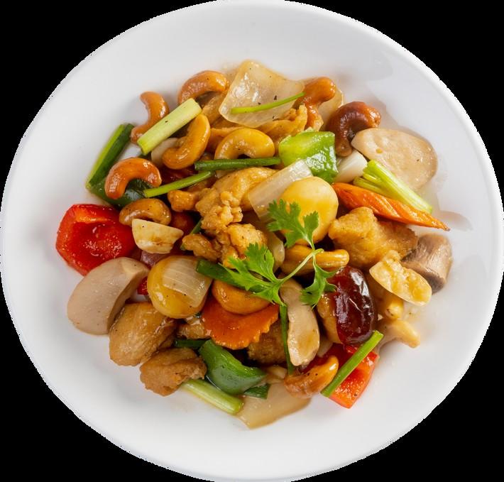 Red bell, carrot, mushroom, onion, celery, scallion, cashew nut in the sweet chili paste sauce.