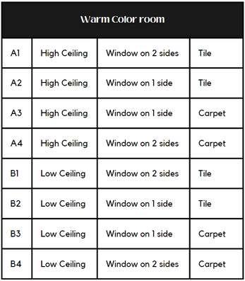 The color of the walls are changed from warm to cool color. The floor material is changed from tiles to carpet to check the illuminance