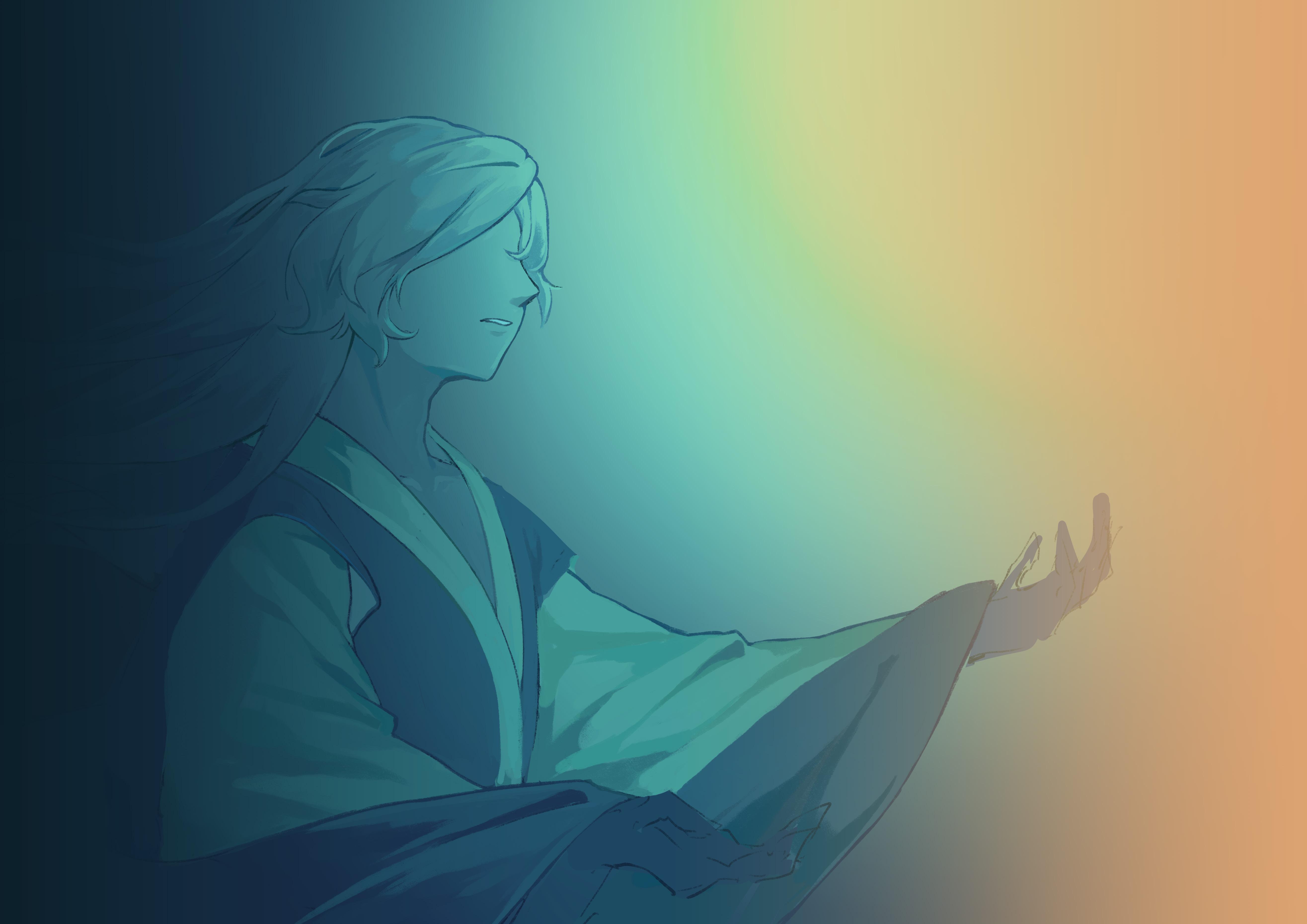 The Sun Goddess looked at him, but didn't answer. Destinies and lies made no difference to her. The flowing light slowly converged and took form: a divinity was born. It was crescent shaped with two sharp ends, and it shimmered with a silvery glow.