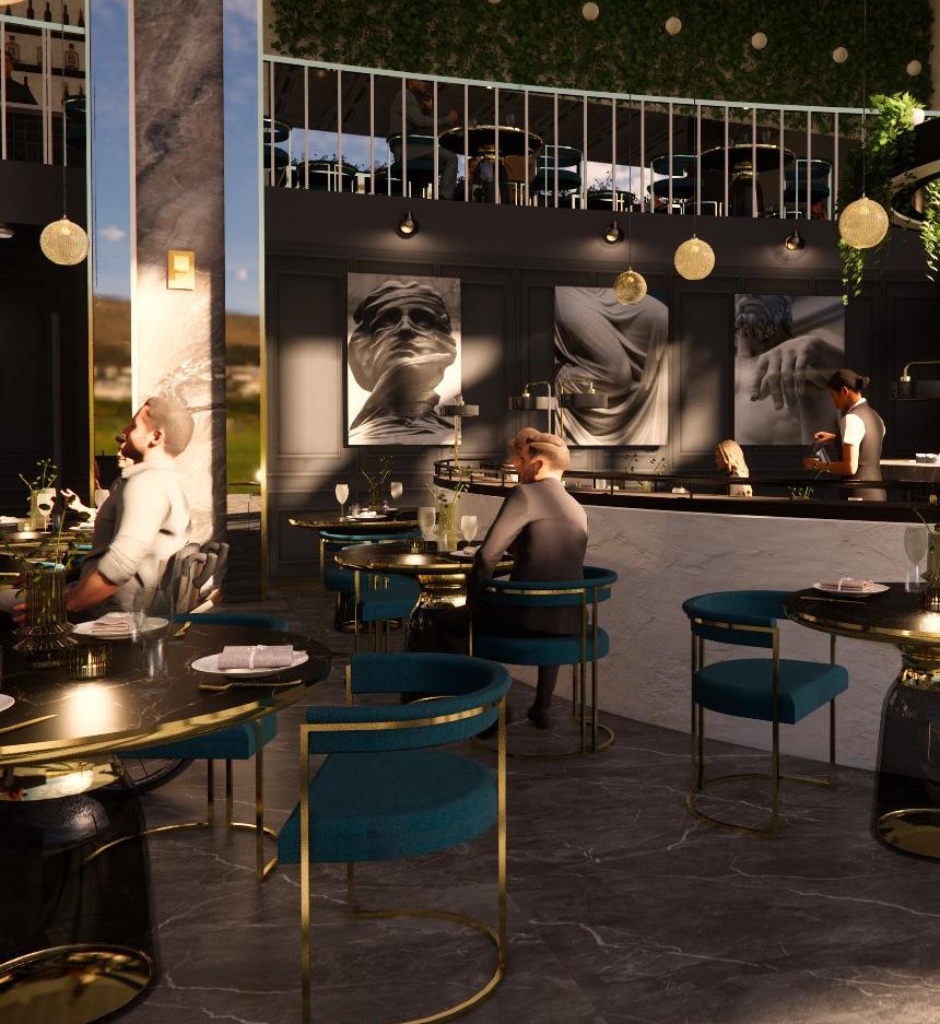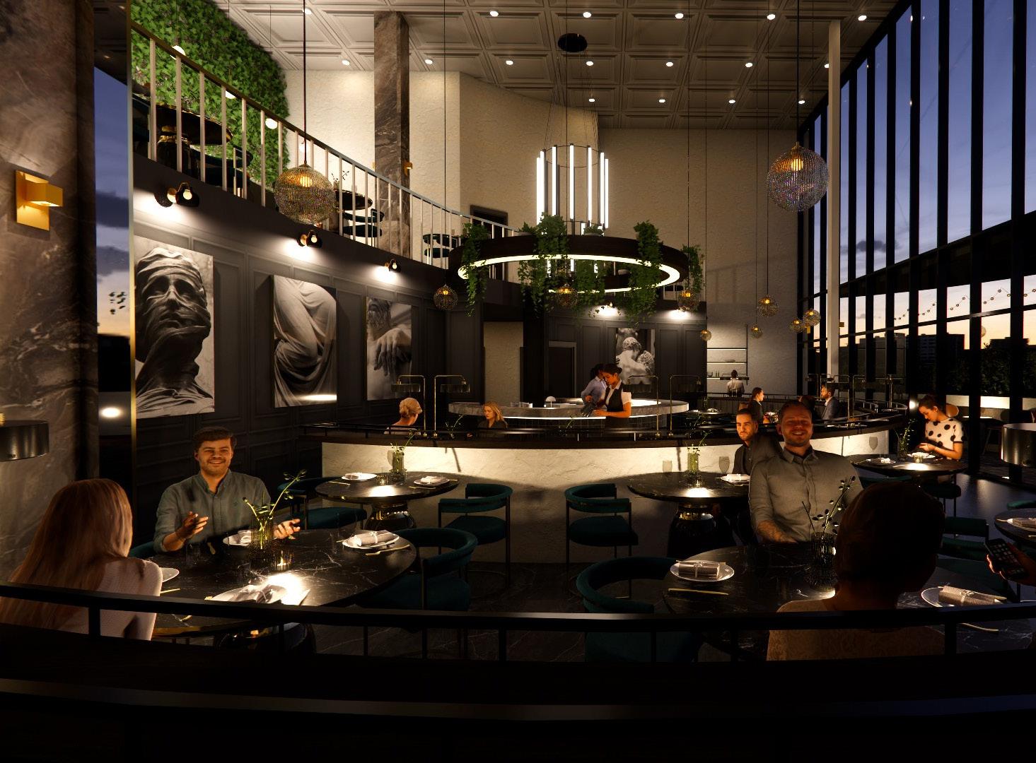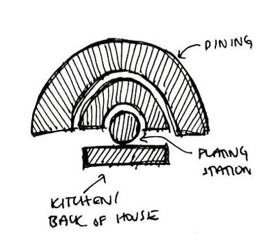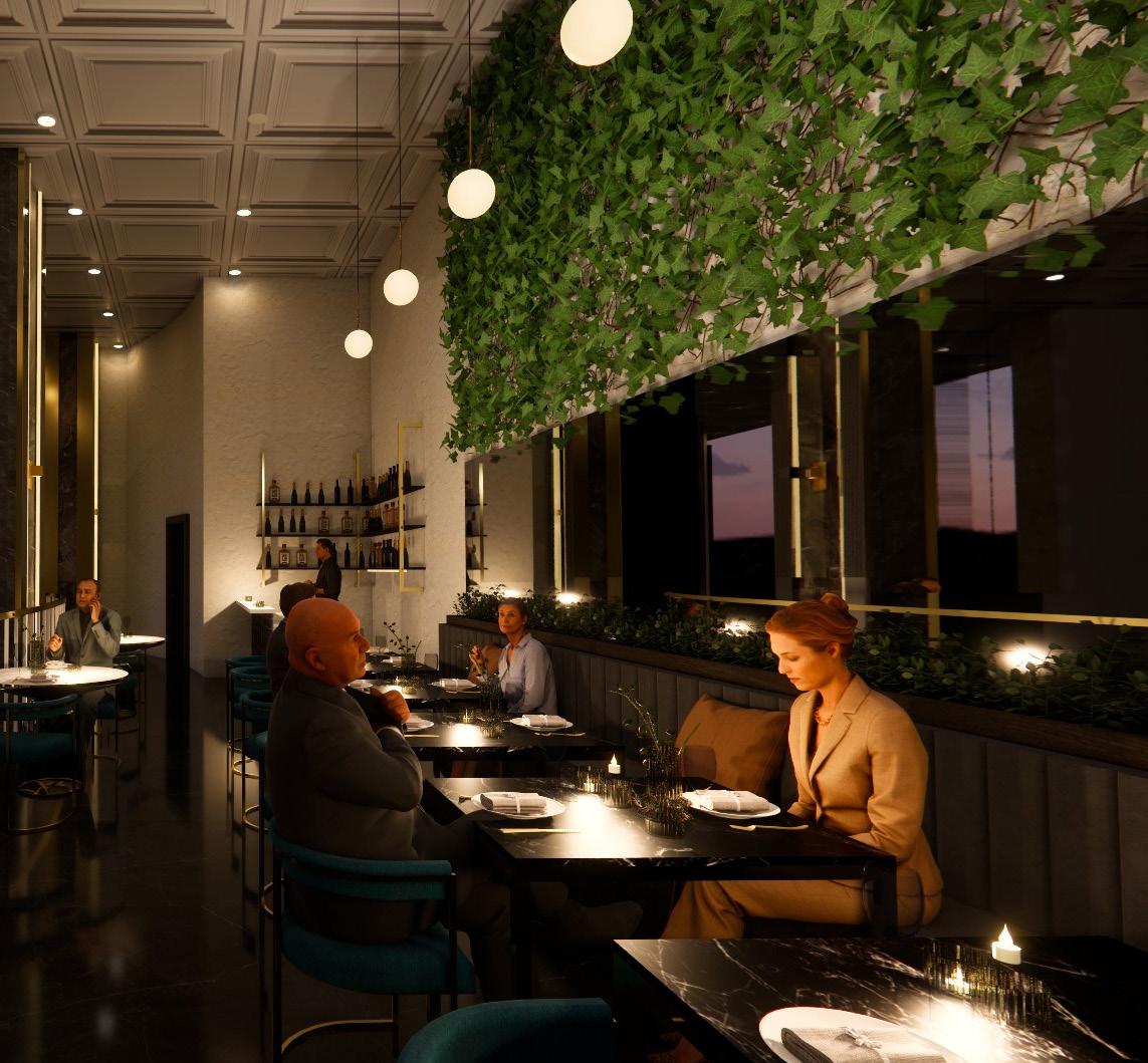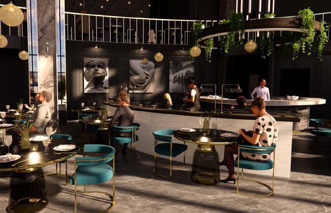 The central zone in this restaurant will be the dining area where a chef will plate guests’ dishes and will be surrounded by arched banquette seating that extends out to the patio.