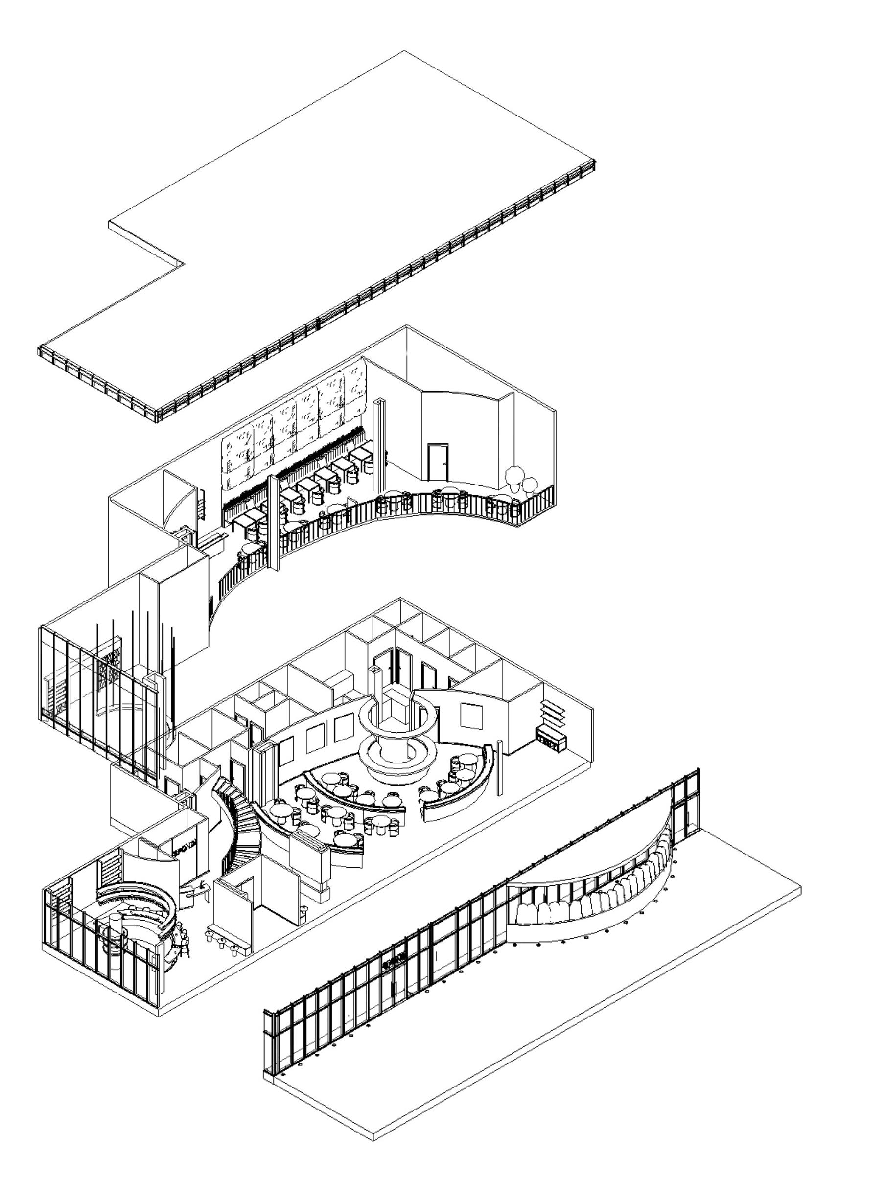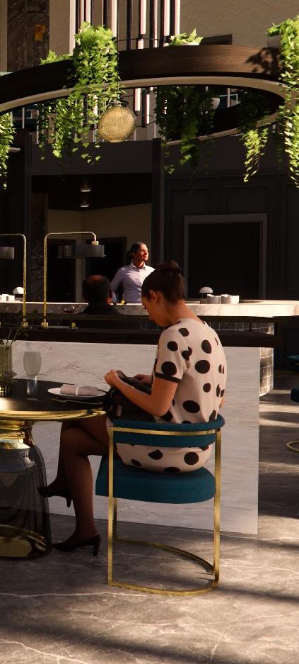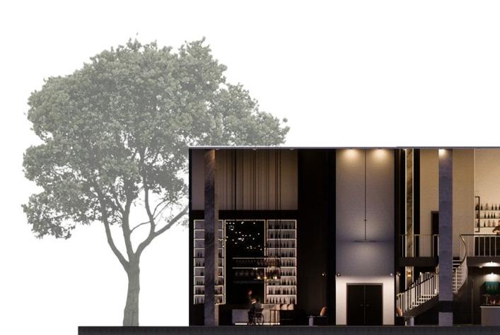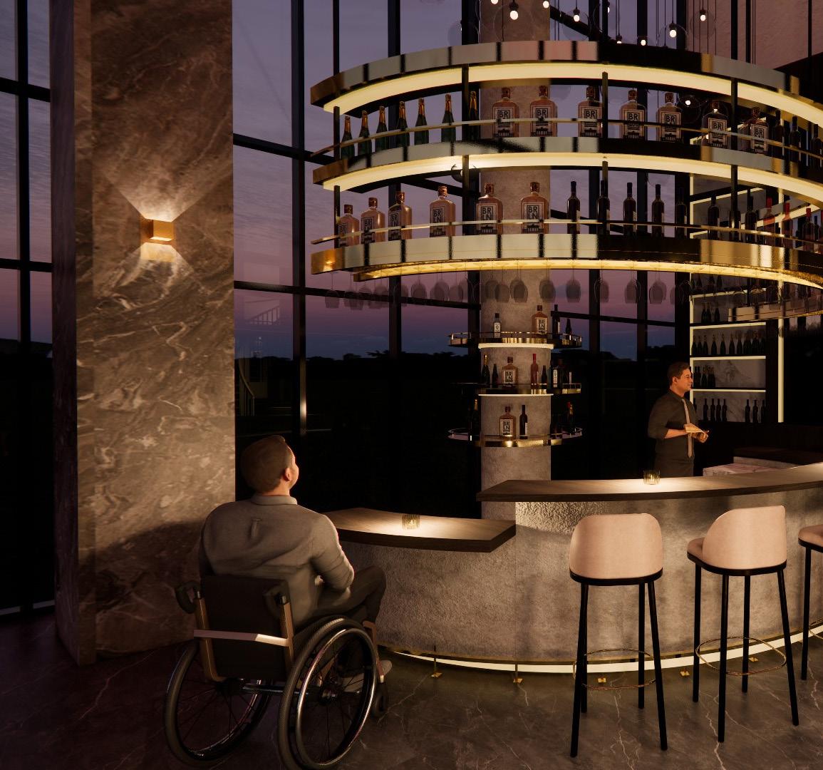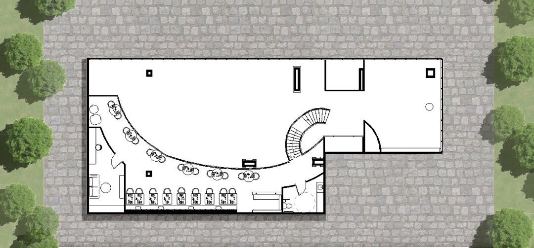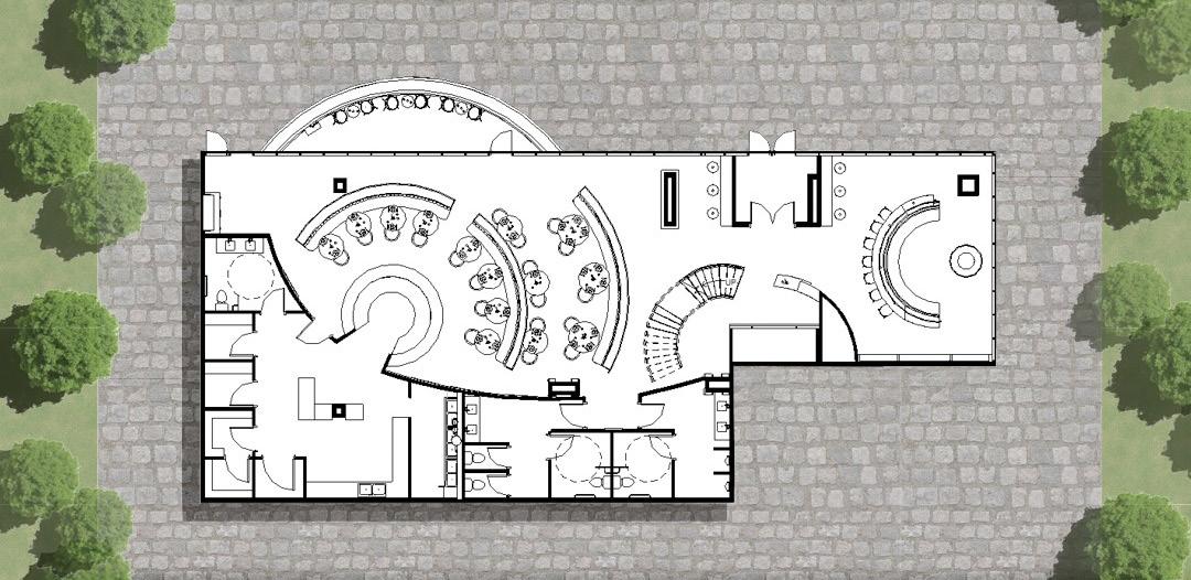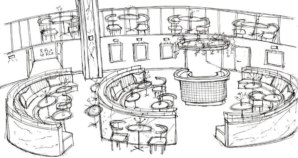 The space planning will adhere to accessibility in terms of elevator location, clearances, and seating height. It will also consider acoustics by separating the bar and dining area to avoid loud noises. The mezzanine floor will follow the curvilinear walls below and will provide seating for guests to oversee the dining area.