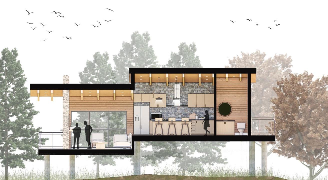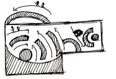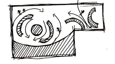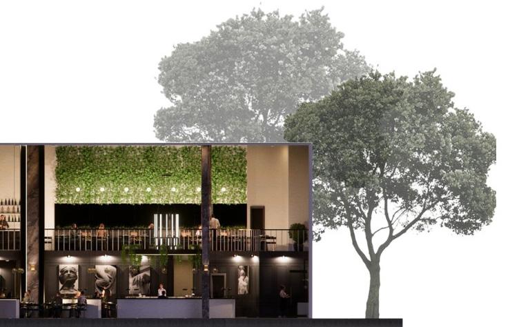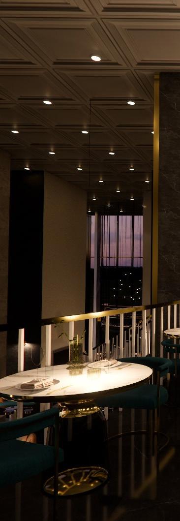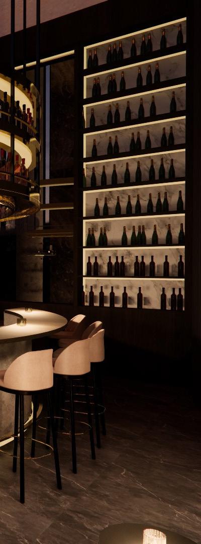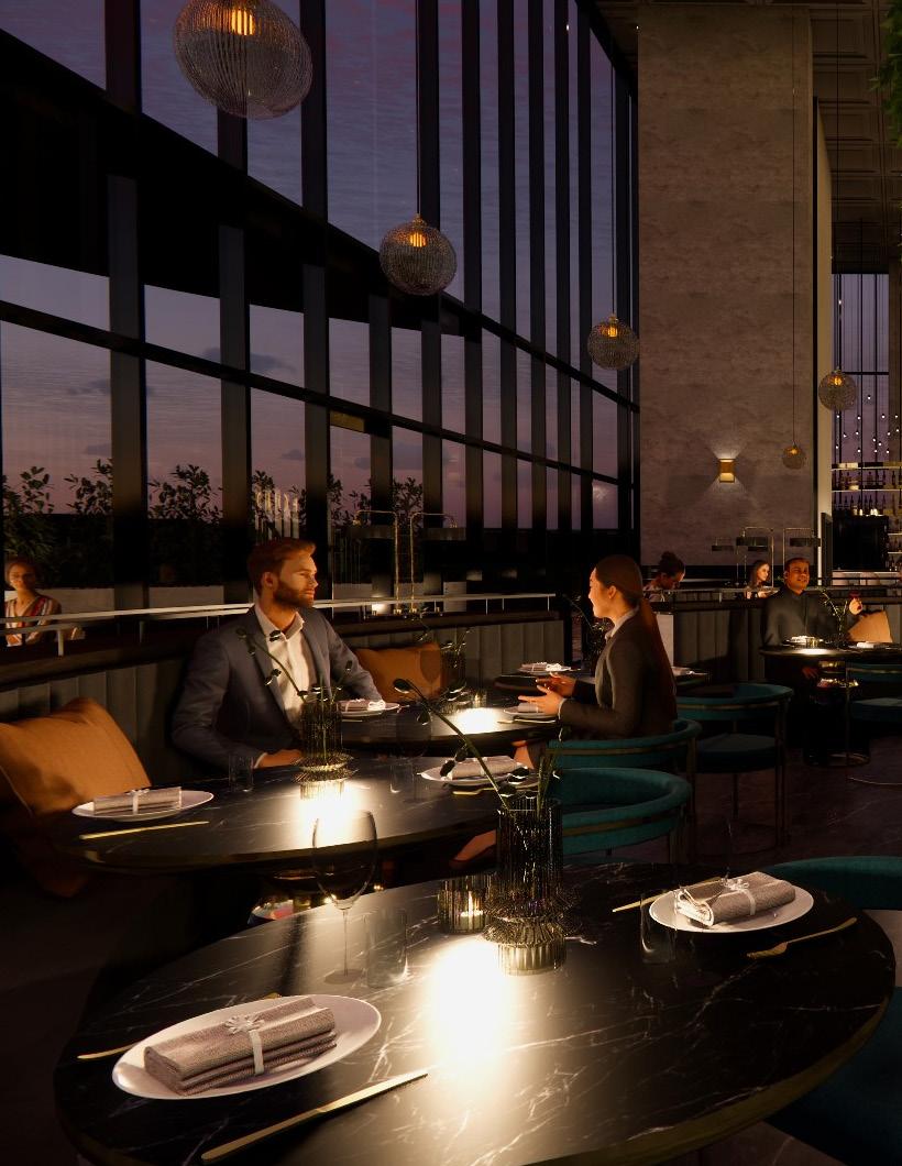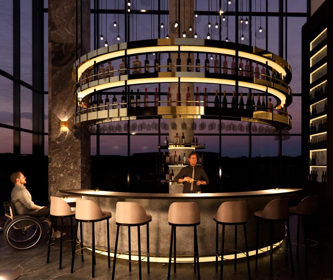 The space planning will adhere to accessibility in terms of elevator location, clearances, and seating height. It will also consider acoustics by separating the bar and dining area to avoid loud noises. The mezzanine floor will follow the curvilinear walls below and will provide seating for guests to oversee the dining area.