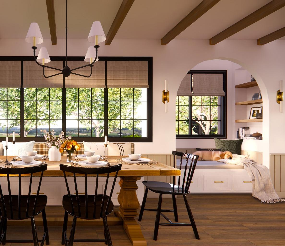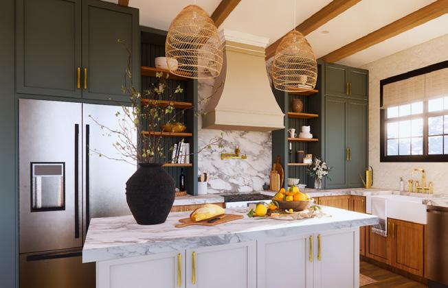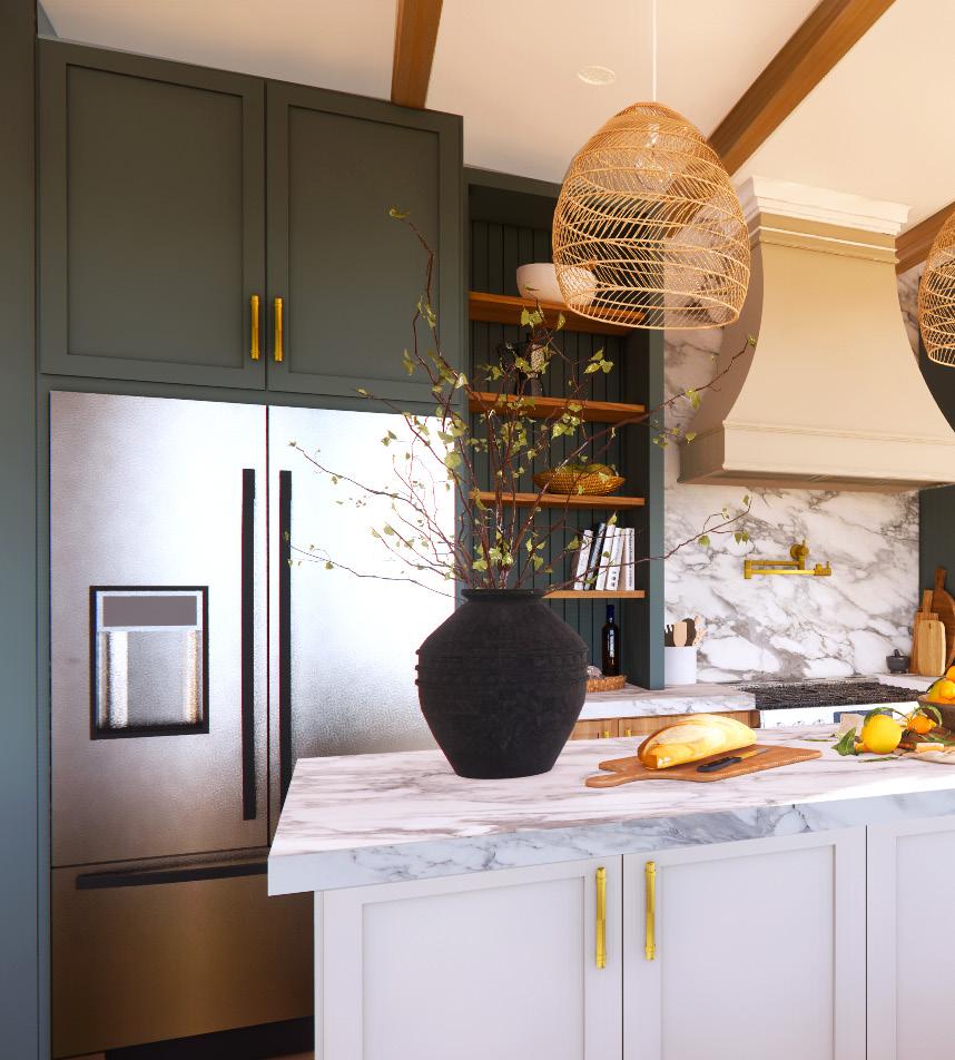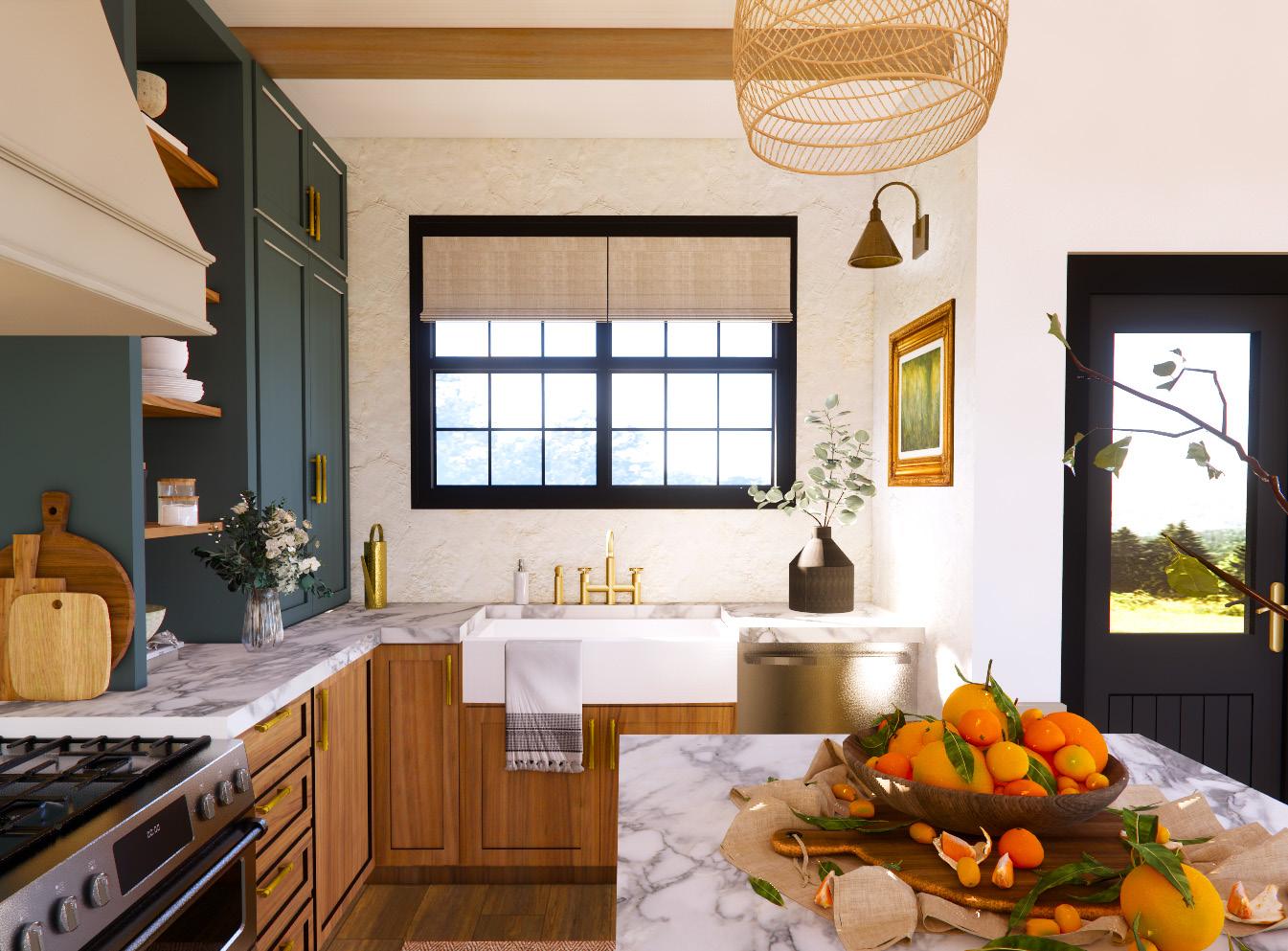 A modern interpretation of a farmhouse-style kitchen and dining room. The use of bold colours and patterns, marble slabs, and brass hardware gives this space a contemporary aesthetic while maintaining warmth through wooden materials. The use of woven-rattan textures give the room greater interest, character, and a sense of life.