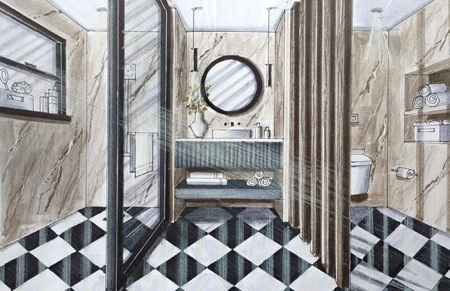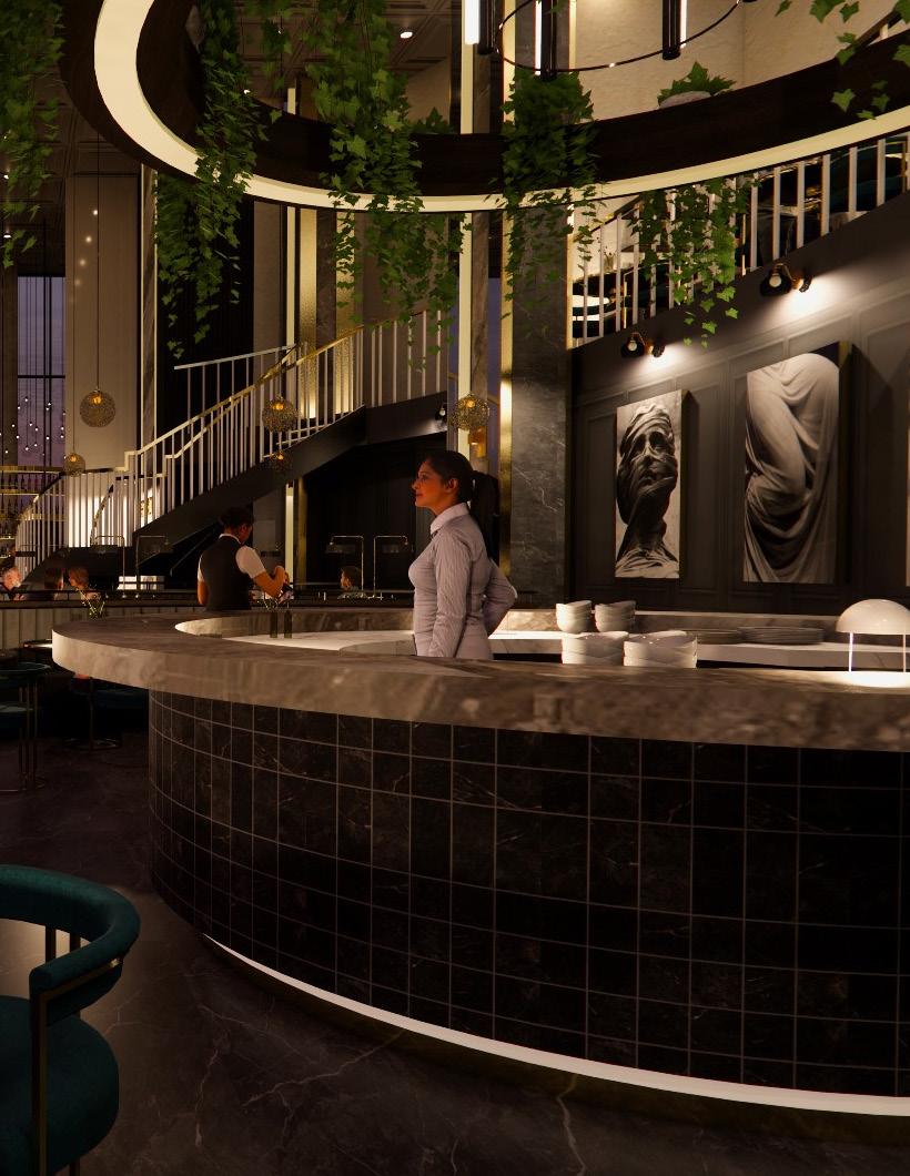 Embracing the brand’s commitment to elegance and the intricate micro-triangular patterns found in diamonds, I have designed a triangular cash and wrap millwork that is suitable for both staff and guests.