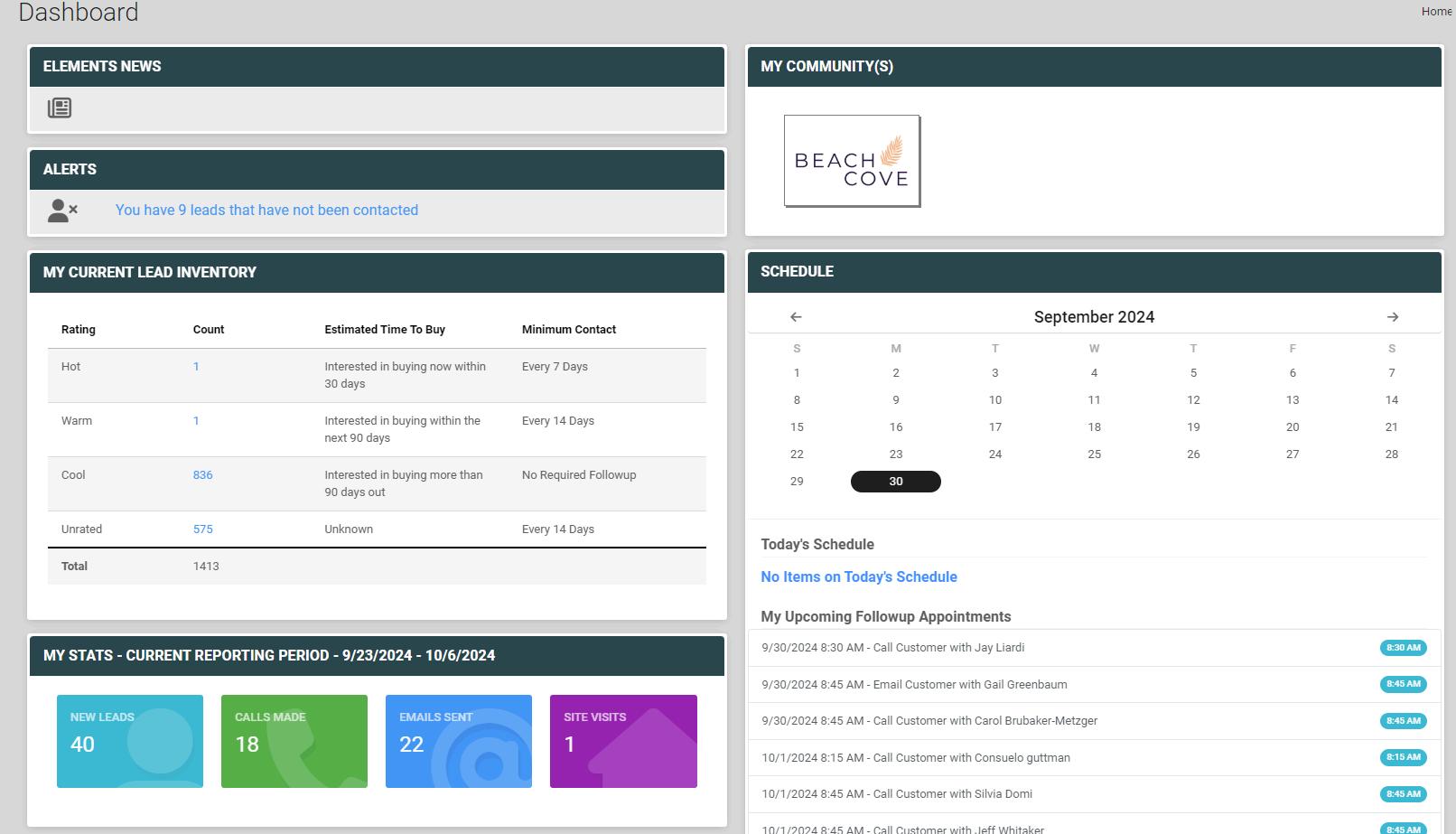 My Stats: Breaks down the numbers for active New Leads, Calls Made, Emails Sent and Site Visits