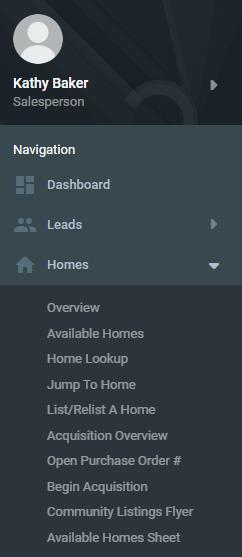 On the left hand side of the Dashboard, you will see the Navigation. This is another way to search Elements for Leads, Homes, Sales Reports, etc.