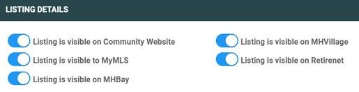 Elements uses data feeds to send your listing information to the community website and other third-party listing sites including: MHVillage | Retirenet | MHBay | MHBO | MyMLS which syndicates to Zillow, Trulia, Realtor com and more