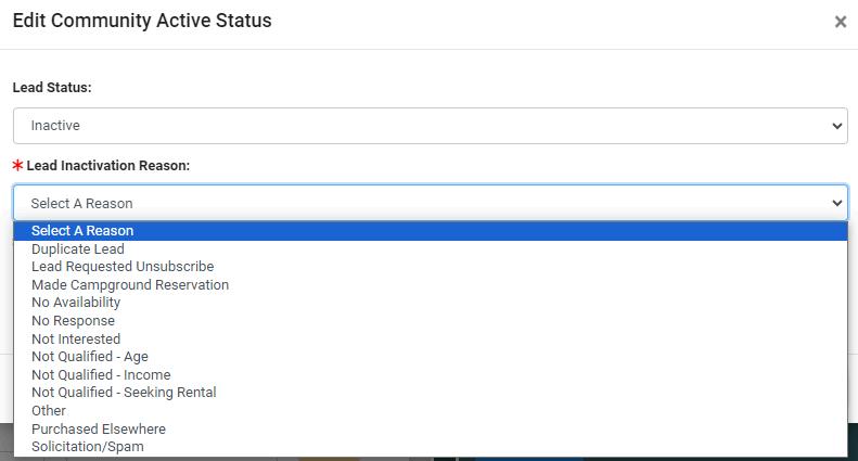 Then select Inactive from the dropdown Select Lead Inactivation Reason and then Save Changes and Close