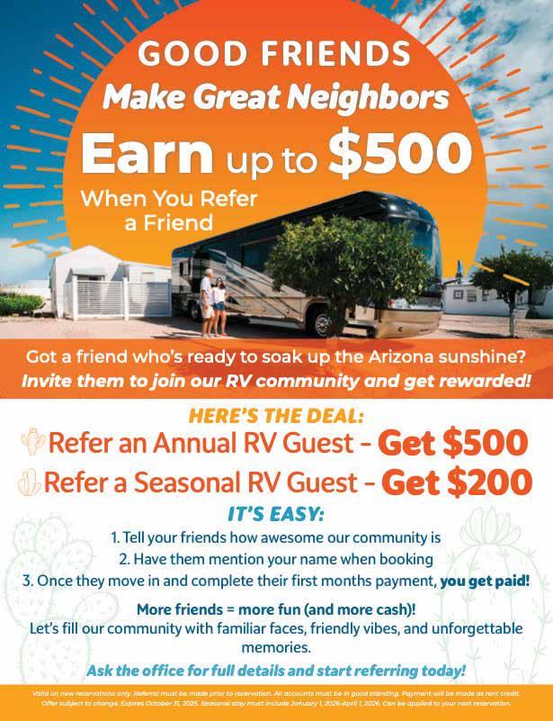 Here it is October already. I can’t believe it’s time for a new season with all our wonderful residents coming back from home, our new residents that have moved in this summer and all our RV friends new and returning. We are excited for this upcoming season, and the recreation board has lots of fun things in store for us coming up this season.