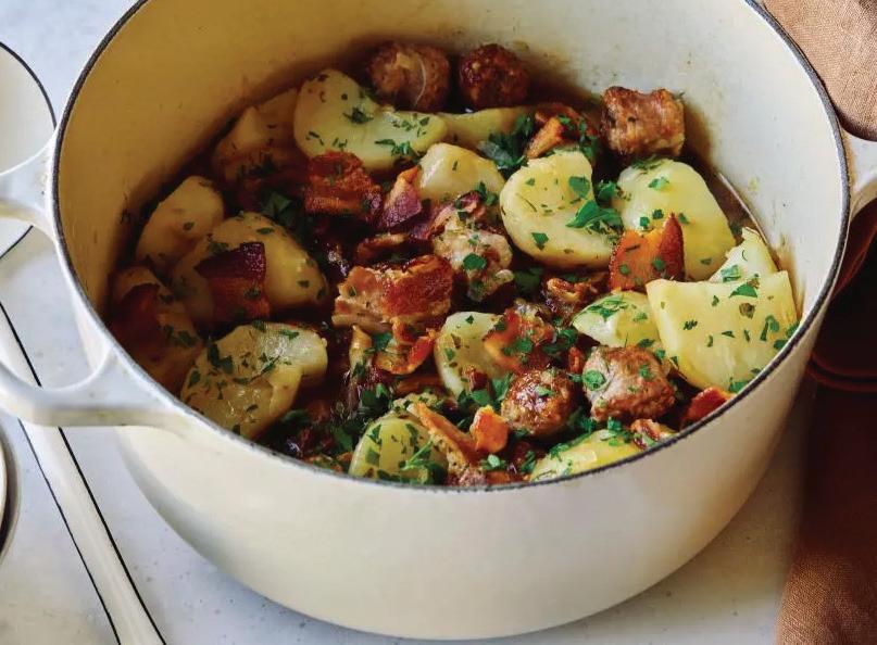 Drain the fat from the pot and return it to medium heat. Add the onions, a pinch of salt and 1/4 cup water. Use a wooden spoon to scrape the brown bits from the bottom and sides of the pot, then sprinkle the onions with 1 tablespoon of the parsley and plenty of black pepper. Layer the bacon and sausage over the onions and sprinkle with 1 tablespoon parsley and more black pepper. Layer the potatoes over the meat and add enough water to submerge everything but the potatoes, about 2 cups. Season the potato layer with a pinch of salt and plenty of black pepper and sprinkle with 1 tablespoon parsley. Bring the liquid to a boil (don’t stir!), then cover and transfer to the oven. Bake, checking halfway to add more water if needed, until the onions are very tender and caramelized and the liquid has reduced slightly, about 2 hours.