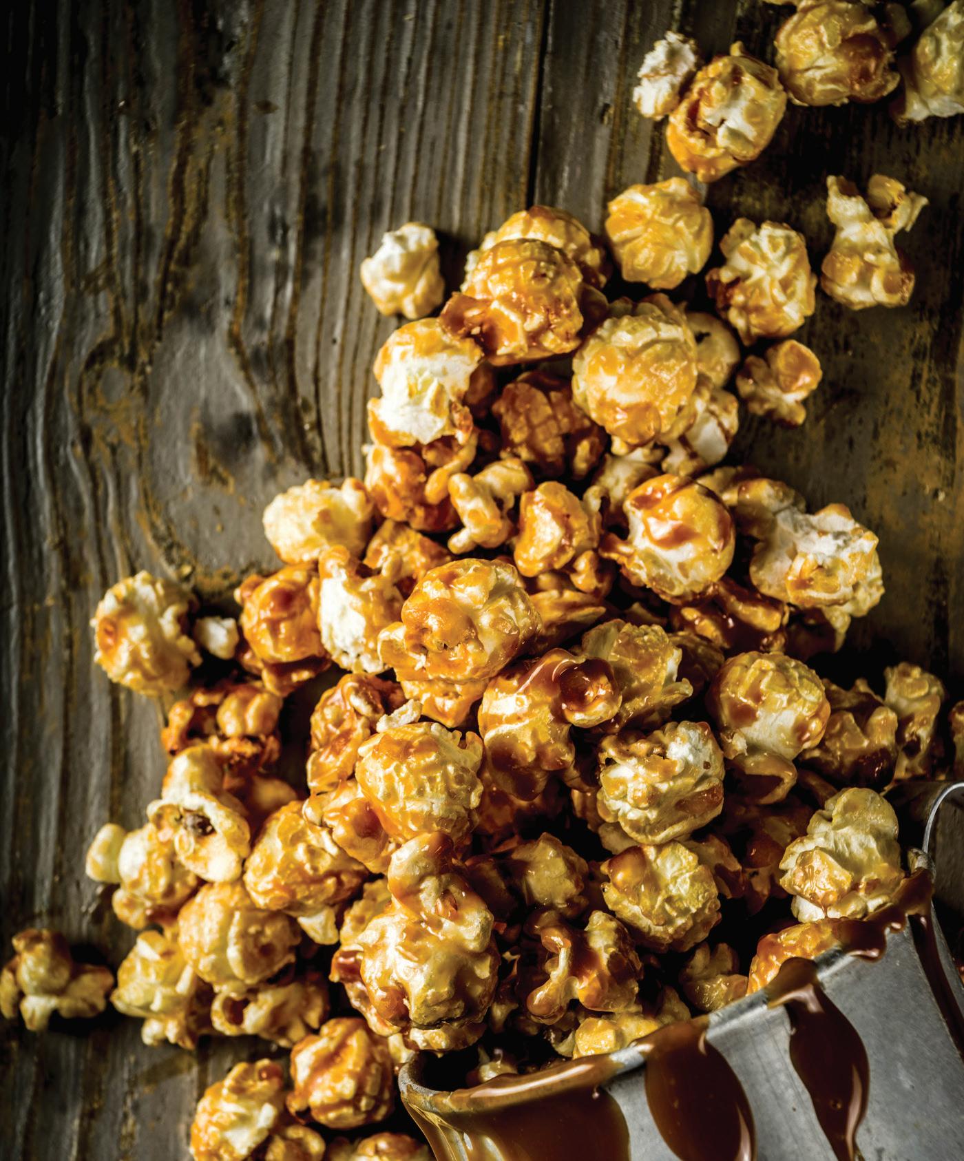 8. Slowly drizzle the mixture over the popcorn, while stirring/tossing the popcorn to coat it with the hot caramel. (It might be easier if you have a kitchen helper. One can pour while the other stirs.)
