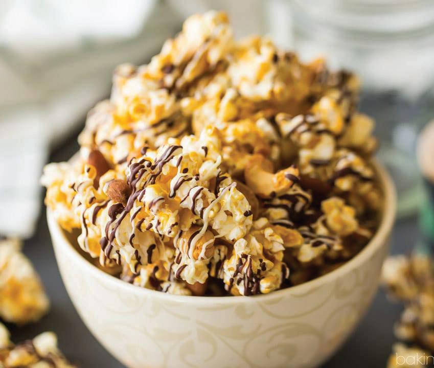 2. Place the popcorn in a large mixing bowl, along with the nuts.