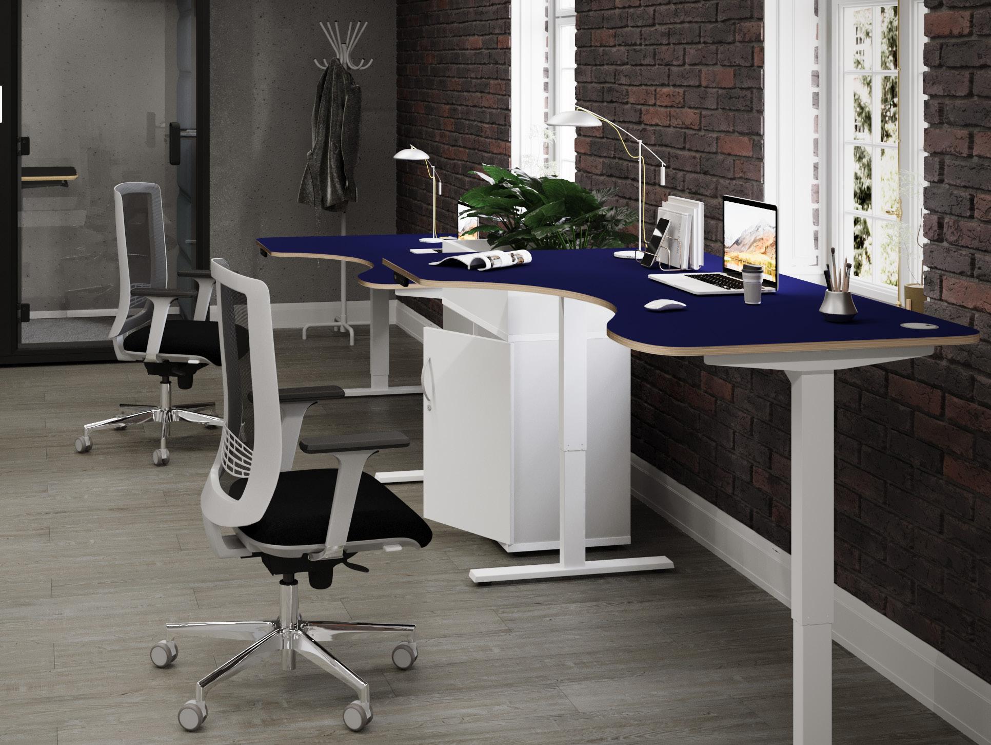RoundE Radial and K tops are crafted to enhance workspace efficiency and comfort. These desks effortlessly integrate into corner spaces or can be clustered to form multiple workstations.