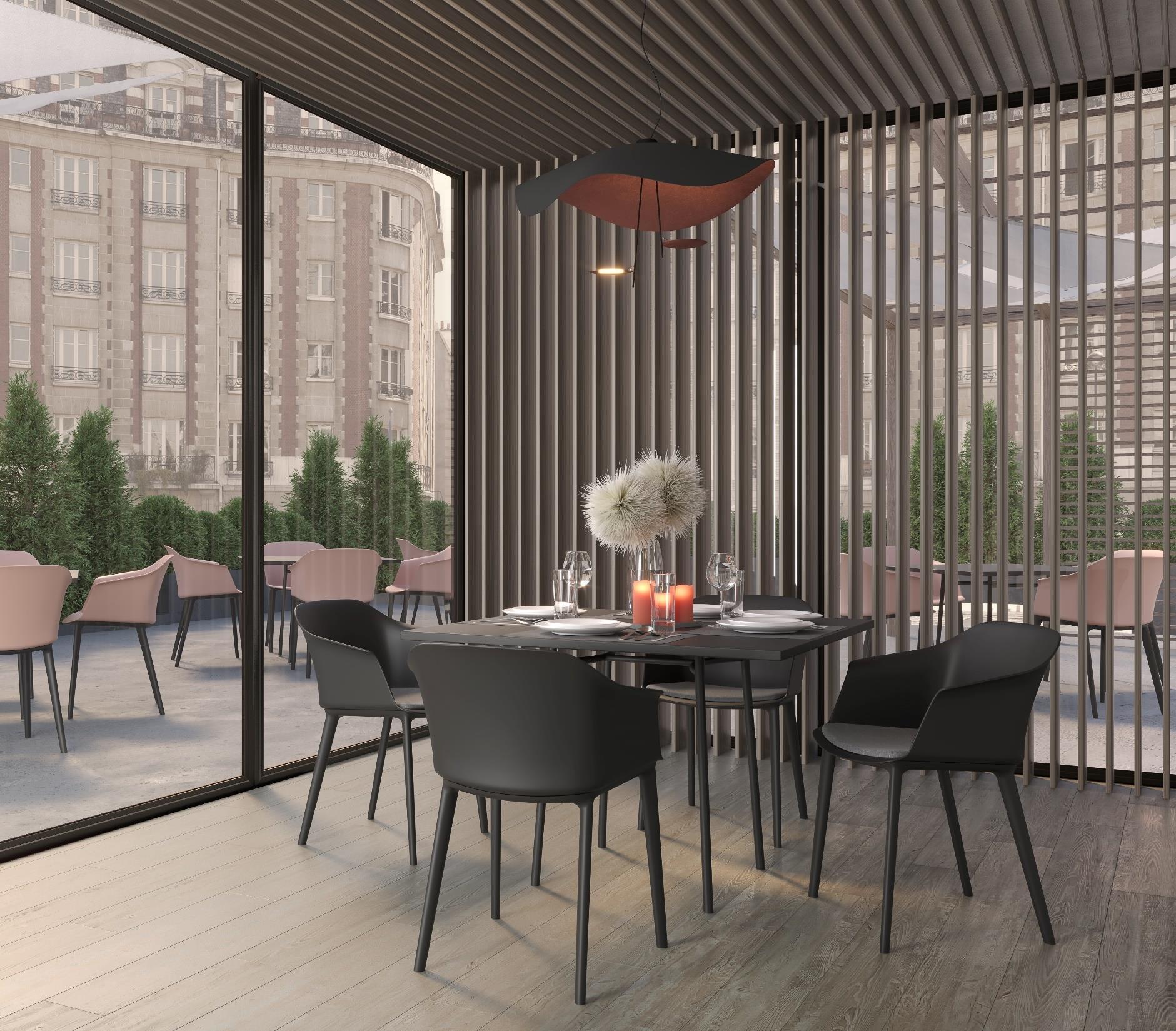 • Stackable chairs and armchairs coupled with a table