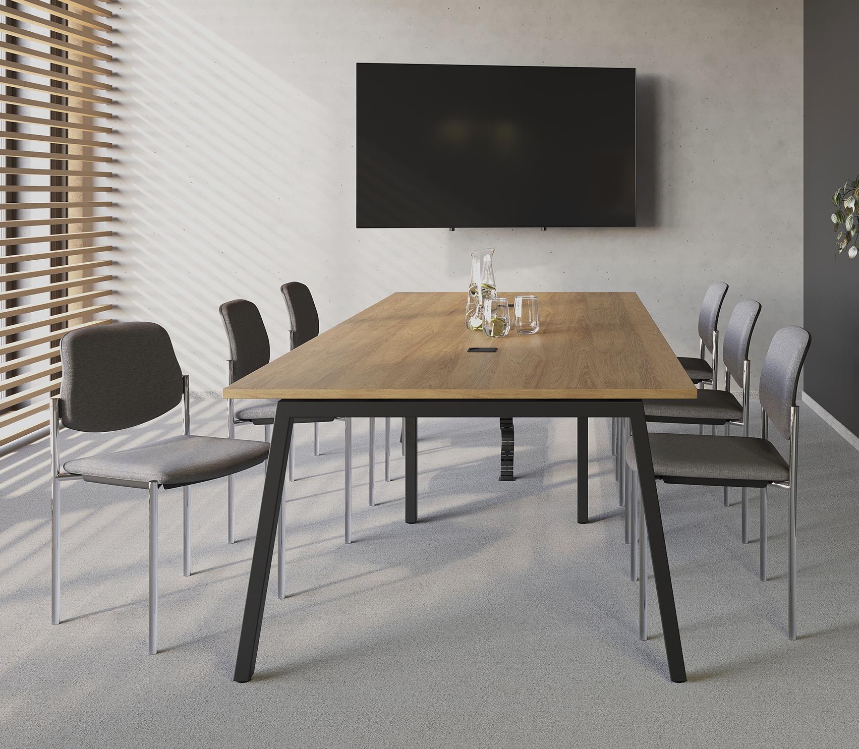 • Rectangular or stadium shaped table tops in two different widths and lengths up to 400 cm Triangular wooden legs