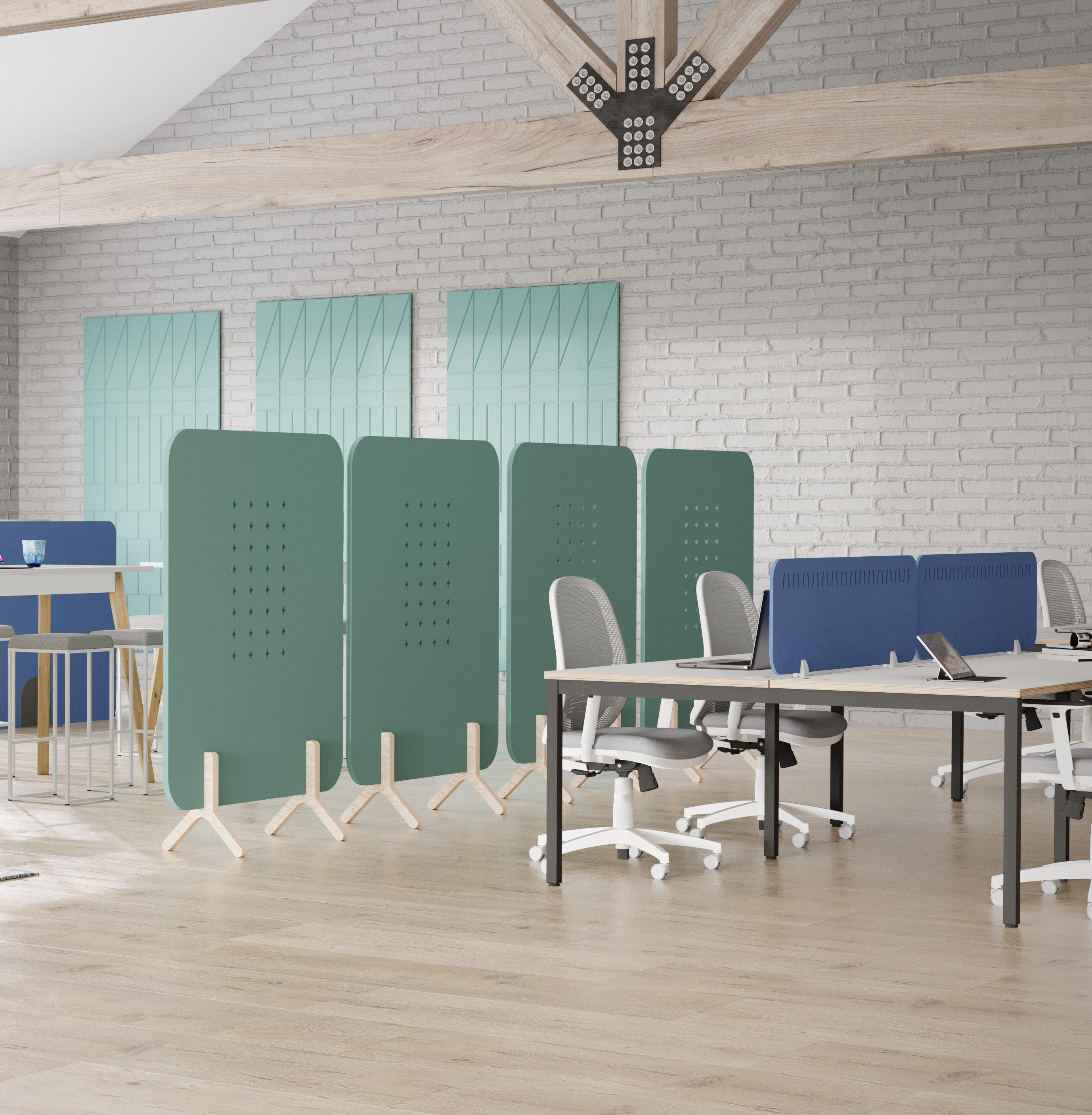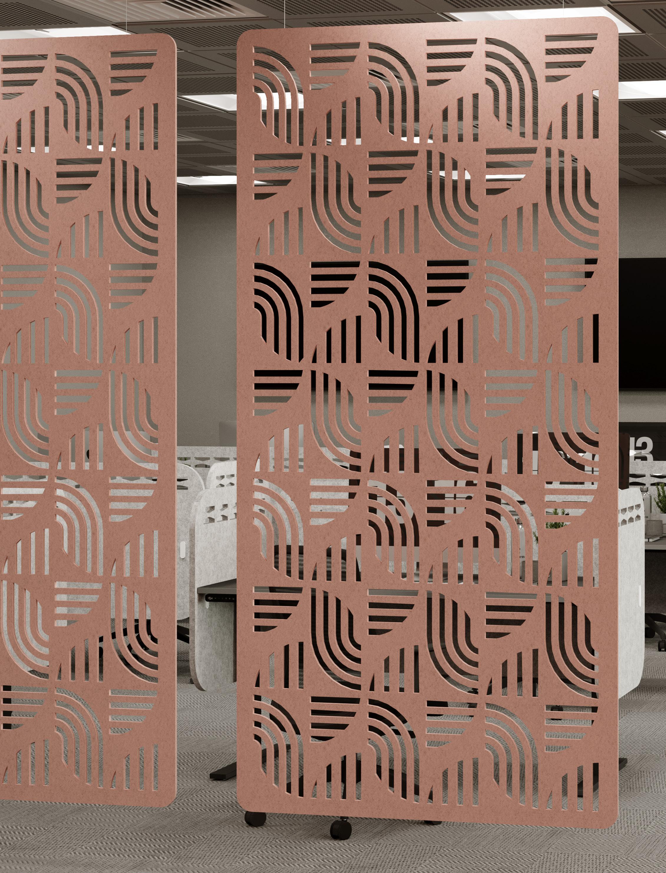 Freestanding Acoustic Screens featuring a crosshatch pattern, accompanied by a wooden stand.