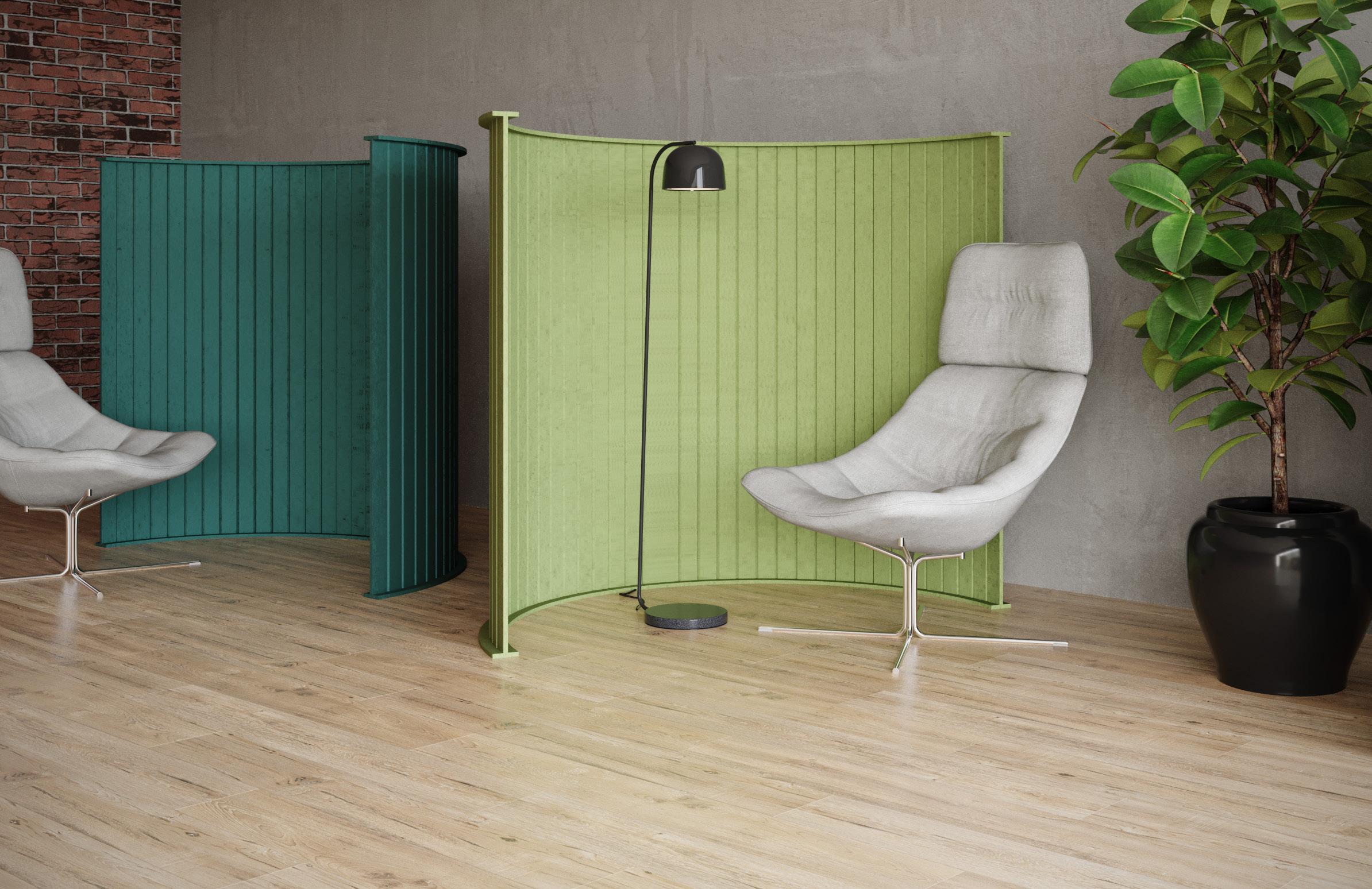 Freestanding Acoustic Screens showcasing a linear pattern with curved edges are offered with a choice of a white or black metal stand.