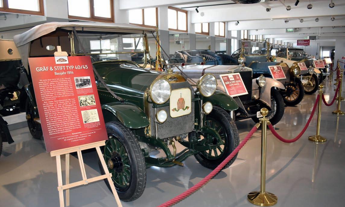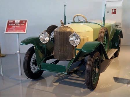 Výroba osobních automobilů Gräf & Stift měla ještě kratší trvání, po roce 1938 se společnost soustředila na nákladní vozy a autobusy, k nimž opět přidala motory vlastní konstrukce, ale vyráběla i kolejová vozidla. Do roku 1902 se dále vyráběly vozy Celeritas s francouskými zástavbovými motory, pak Stift pokračoval do roku 1907 s vozy Spitz, ale když zadavatel Arnold Spitz zkrachoval, spojil své síly naplno s bratry Gräfy. Nejprve vznikly malé série čtyřválců, označených podle daňového a skutečného výkonu 16/22 PS, 18/32 PS, 28/45 PS a 35/65 PS, jejichž velkoobjemové motory SV měly objem válců 4240, 5880, 7320 a 9500 cm3. Následník rakousko-uherského trůnu František Ferdinand d’Este spolu s manželkou Žofií Chotkovou zahynul v červnu 1914 při atentátu v Sarajevu právě v okamžiku, kdy byl vezen vozem typu 18/32 PS, který zapůjčil hrabě František Maria Alfred z Harrachu (vůz se dochoval v Muzeu vojenské historie ve Vídni). Tato první fáze v letech 1908 až 1914 vlastně znamenala kusovou zakázkovou výrobu. Dostupnější vozy znamenaly lehké městské modely VK, resp. VK II (dva jsou na výstavě). Dostaly relativně malý čtyřválec 1940 cm3 (ø 72 x 122 mm) o výkonu 18 kW (25 k) se spodovými ventily SV, zvýšený na 22 kW (30 k)/ 2800 min-1 ve verzi VK II s rozvodem OHV od roku 1926. V letech 1920 – 1928 vzniklo asi 800 vozů obou ►►►