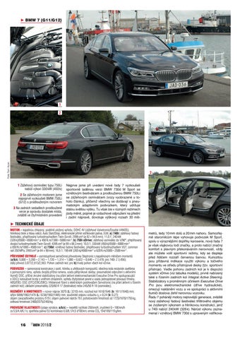 metrů, tedy 10 mm dolů a 20 mm nahoru. Samozřej mě staromilcům lépe vyhovuje podvozek M Sport, spolu s výraznějšími doplňky karoserie, nová řada 7 je však vlajkovou lodí značky, a proto nabízí značný komfort s plavným překonáváním nerovností, vždy ale můžete volit sportovní režimy, kdy se displeje před řidičem rozzáří červenou barvou. Kuriozitou jsou přídavná indikace využití výkonu a točivého momentu ve středu přístrojové desky (tzv. sportovní přístroje). Vedle pohonu zadních kol je k dispozici systém xDrive (viz tabulka modelů), prvně nabízený také s řízením zadních kol Integral Active Steering. Stabilizátory s proměnným účinkem Executive Drive Pro jsou elektromechanické (dříve hydraulické), omezují naklánění vozu a ve spolupráci s aktivními tlumiči doslova žehlí nerovnou vozovku. Řadu 7 pohánějí motory nejnovější generace, zvláště nový zážehový řadový šestiválec třílitrového objemu se zvýšeným výkonem a hliníkovou konstrukcí, jenž u 740i nabízí 240 kW (326 k). Nárůst výkonu zazna menal i vznětový BMW 730d s upraveným vstřikova