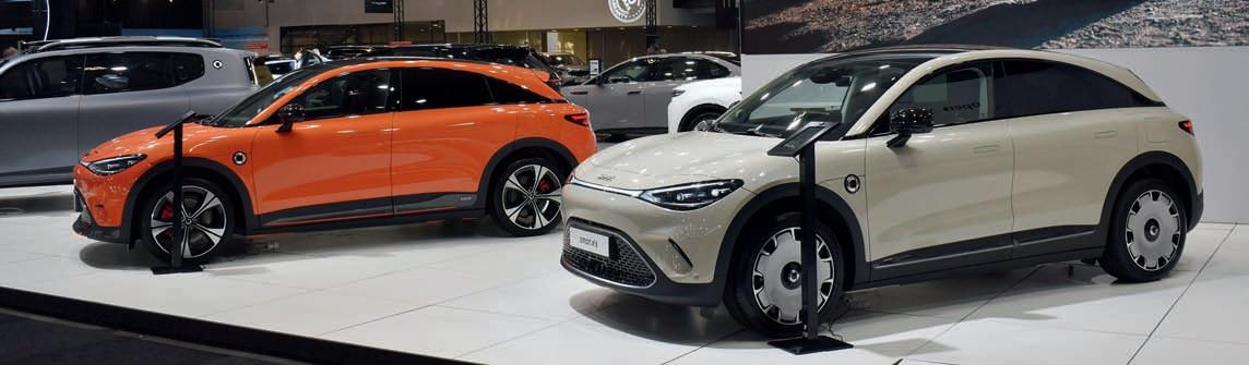 značkami, z nichž zejména Volkswagen, Seat/Cupra, Audi a Porsche představily téměř kompletní sortiment. V sekci D’Ieteren Luxury Performance jsme si prohlédli mimo jiné Bugatti Bolide z limitované série čtyřiceti vozů, posledních s motory W16, a to v evolučním stupni s výkonem 1176 kW (1600 k). Nechyběl ani elektrický Rimac Nevera R, který se sníženou hmotností, akumulátory 108 kWh a větším výkonem 1550 kW (2107 k) zrychlí na 300 km/h za 8,66 sekundy! Zajímavým exponátem byl nový MercedesBenz CLA v kamufláži z testovacích jízd (premiéra bude v březnu), ale také luxusní roadster MercedesMaybach SL 680 a samozřejmě plně elektrická verze GKlasse. Značku Smart chtěl sice MercedesBenz zrušit, ale nakonec ji zachoval v partnerství s Geely Holding. Nové elektrické modely Smart #1 (první SUV značky), #3 a nejnovější #5 však mají pramálo společného s původní myšlenkou městského vozu, proti Smartu ForTwo totiž dostaly až trojnásobnou hmotnost! Jsou to také první Smarty z čínské produkce na platformě Geely SEA2, resp. PSA2+, tedy spřízněné např. s Volvo EX30,