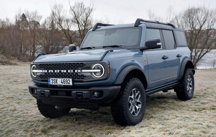 Universal (předchůdce Wrangleru). První Bronca vystačila s řadovým šestiválcem 2,8 litru o výkonu 77 kW (105 k), ale hned odpočátku bylo možno připlatit za osmiválec 4,7 litru, známý z Mustangu, který americká televizní reklama označila za kamaráda ze stejné stáje! Měl jsem štěstí, v Mustangu 289 V8 jsem jel u nás ještě za minulého režimu, ale na Bronco jsem si musel počkat několik desetiletí až do loňského listopadu! Vozy Bronco se průběžně zvětšovaly, sílily a byly stále komfortnější při zachování vynikajících jízdních vlastností v terénu. Novinka šesté generace, uvedená po čtvrtstoletí, nezapře DNA originálu, ale také vliv Mustangu a bestselleru FSeries. Dobrodružnou povahu Broncu vtiskuje koncepce s tuhým žebřinovým rámem, karoserie s lehce snímatelnými panely, silný zážehový šestiválec 2,7 litru TwinTurbo a vyspělý systém pohonu všech kol s až sedmi režimy G.O.A.T. (Goes Over Any Type of Terrain) podle druhu terénu (ano, anglicky goat, tedy koza, si také poradí se všemi terénními překážkami). Odpružení HOSS (HighPerformance OffRoad Stability Suspension) nabízí zdvih kol až 259 milimetrů, v extrémní verzi Badlands (testovaný vůz) navíc