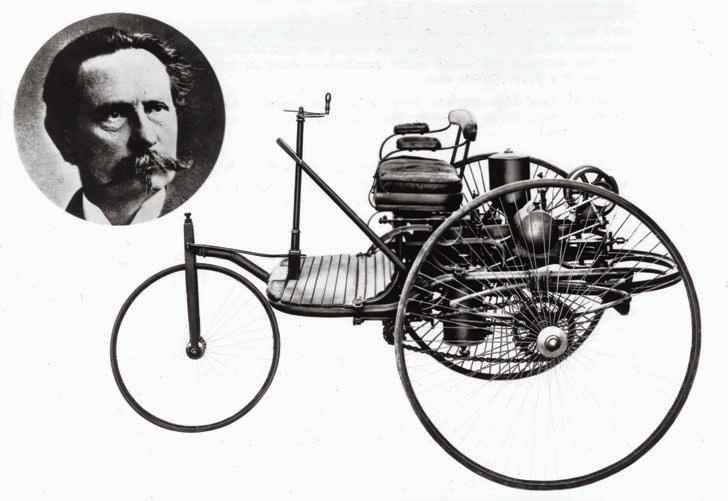 Karl Benz a jeho první Benz Patent Motorwagen, lehká tříkolka s rychlostí do 16 km/h, představená v jízdě dne 3. července 1886 v Mannheimu a okolí