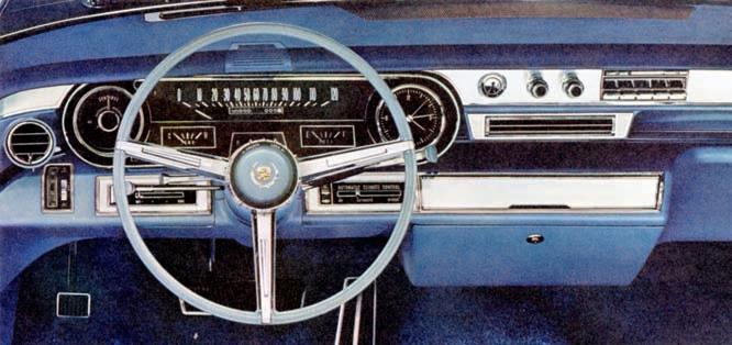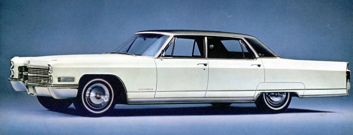 zdůrazňoval velké natočení předních kol až o 38,5 stupně pro snazší manévrování a malý průměr otáčení! Standardní (a jedinou) pohonnou jednotkou v letech 1964 – 1967 byl vidlicový osmiválec 429 CI, tedy o obje mu 7030 cm3 (ø 104,9 x 101,6 mm), se stupněm kom prese 10,5 a výkonem 250 kW (340 k)/4600 min‑1. Pro rok 1966 dostal motor nový čtyřhrdlový karburátor Rochester s automatickým sytičem, měl plnoprůtokový čistič oleje a dvouventilový tyčkový rozvod OHV. Na motor přímo navazovala samočinná třístupňová převodovka GM Turbo Hydra Matic s kapalinovým mě ničem momentu a s rozvodovkou zadní nápravy ji spo joval dvoudílný kloubový hřídel. Spotřebu benzinu (teh dy ještě olovnatého) nikdo neřešil, dvacet litrů na sto kilometrů se dalo udržet při klidné jízdě, ale ani třicet nebylo výjimkou. Vozy na pneumatikách rozměrů 9,00 x 15 dosahovaly rychlosti kolem 180 km/h. Běloboké pneumatiky byly za příplatek, pouze pro kabriolet Flee twood Eldorado v základní výbavě. Samočinná klimati zace se montovala do vrcholných modelů Fleetwood 75, jinak se rovněž připlácelo, ale Cadillac Heater & Defros ter (tedy topení a odmrazovač) se dodávaly standardně (pro teplé kraje mohl být vůz bez nich za příslušnou slevu). Přední sedadla se seřizovala elektricky, stejně jako ovládala okenní skla (s výjimkou typů Calais). Nejlevnější byla Calais Series, nabízená jako kupé, se dan a čtyřdveřový hardtop (tedy sedan bez středního bočního sloupku B, jaký nemělo ani Coupé). Rozvor náprav 3289 mm a celkovou délku 5690 mm sdílely mo dely Calais s výše postavenými a ještě lépe vybavenými DeVille, u nichž nabídku stejných druhů karoserie roz šířil dvoudveřový kabriolet. Obrovský zadní převis byl pro tyto majestátní automobily typický, stejně jako pros torný šestimístný interiér na průběžných lavicích seda del, pokud nebyla vzadu či vpředu vyklopena středová opěrka rukou. Převodovka Turbo Hydra Matic a posilo vače řízení Cadillac Power Steering a bubnových brzd Cadillac Power Brakes byly zdůrazňovanou základní výbavou, stejně jako třírychlostní stírače s ostřikovači čelního skla a bezpečnostní pásy na všech sedadlech (na krajních samonavíjecí). V té době to nebyla samo zřejmost. Klient mohl také zvolit vpředu dvě samostatná křesla s integrovanými opěrkami hlavy. Vrcholem řady byla Fleetwood Series s rozvorem ná prav prodlouženým na 3378 milimetrů, resp. na 3804