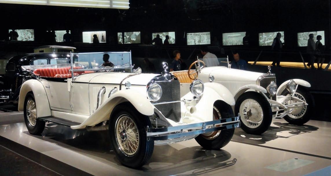 1 Dva sportovní vozy Mercedes-Benz 26/120/180 PS Typ S, šestiválec 6788 cm3 z roku 1928, a menší Mercedes 10/40/65 PS Sport, čtyřválec 2614 cm3 z roku 1923