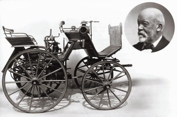 Gottlieb Daimler a jeho Motorkutsche, první automobil se čtyřdobým jednoválcem 462 cm3 o výkonu 0,8 kW (1,1 k)/650 min-1 a největší rychlostí 18 km/h (1886)