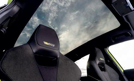 Sportline nebo RS (na snímcích) se liší provedení interiéru, který však vyniká kvalitním zpracováním už na první pohled 3 Obrovská prosklená střecha je standardní výbavou verze RS Konstrukce Coupé se s výjimkou upraveného tvaru karoserie v zadní části od prvního Enyaqu (SUV) prakticky neliší, většina rozměrů zůstává shodných, rozdíly jsou opravdu minimální. Splývající záď lehce zmenšila objem zavazadlového prostoru, který je však se 570 litry (po sklopení opěradel až 1610 litrů) více než vyhovující. Rovněž přístrojová deska zůstává shodná, přibyly jen neviditelné softwarové inovace, které jsou i za zvýšením celkového výkonu v dvoumotorovém provedení