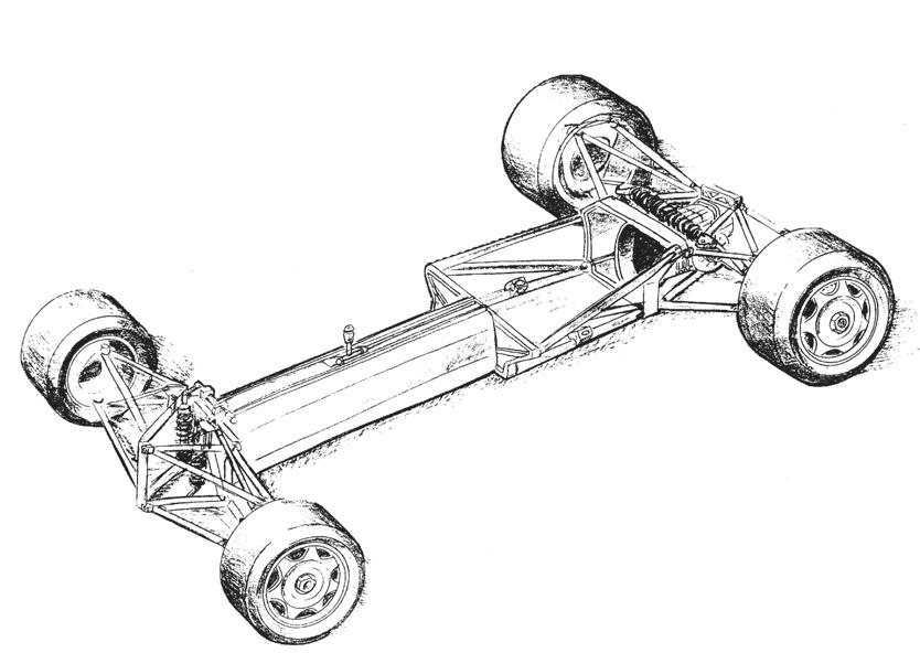 ▲ Páteřový rám z hliníku nese nezávislé zavěšení kol a vzadu je rozšířen pro uložení motoru Zavěšení kol systému pushrod, zadní s vodorovně a příčně uloženými pružicími jednotkami, přední se svislými jednotkami odpružení