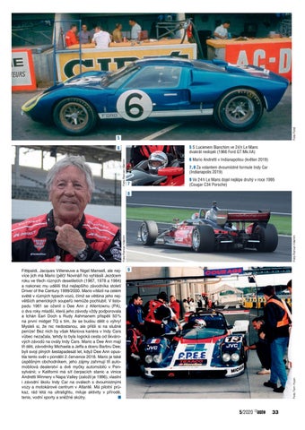 Fittipaldi, Jacques Villeneuve a Nigel Mansell, ale nej více jich má Mario (pět)! Novináři ho vyhlásili Jezdcem roku ve třech různých desetiletích (1967, 1978 a 1984) a nakonec mu udělili titul nejlepšího závodníka století Driver of the Century 1999/2000. Mario vítězil na celém světě v různých typech vozů, čímž se většina jeho nej větších amerických soupeřů nemůže pochlubit. V listo padu 1961 se oženil s Dee Ann z Allentownu (PA), o dva roky mladší, která jeho závody vždy podporovala a tchán Earl Doch s Rudy Ashmanem přispěli 50 % na první midget TQ s tím, že se budou dělit o výhry! Mysleli si, že nic nedostanou, ale přišli si na slušné peníze! Bez nich by však Mariova kariéra v Indy Cars vůbec nezačala, tehdy to byla logická cesta od škváro vých závodů na ovály Indy Cars. Mario a Dee Ann mají tři děti, závodníky Michaela a Jeffa a dceru Barbru Dee; byli svoji plných šestapadesát let, když Dee Ann opus tila tento svět v pondělí 2. července 2018. Mario je také úspěšným obchodníkem, jeho zájmy zahrnují tři auto mobilová dealerství a dvě myčky automobilů v Pen sylvánii; v Kalifornii má síť čerpacích stanic a vinice Andretti Winnery v Napa Valley (založil je 1996), vlastní i závodní školu Indy Car na oválech s dvoumístnými vozy a motokárové centrum v Atlantě. Má pilotní prů kaz, rád létá na ultralightu, miluje aktivity v přírodě, tenis, vodní sporty a sněžné skútry. ■