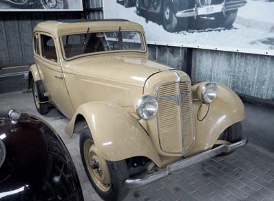 1 Adler Trumpf Junior 1E (1936), populární německý vůz, který se dostal po válce do Rigy jako sovětská válečná kořist
