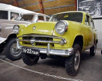 3 Moskvič 410 N, jeden z prvních osobních vozů s pohonem všech kol, čtyřválec 1,4 litru (celkem 11 890 vozů včetně kombi v letech 1957 – 1960)