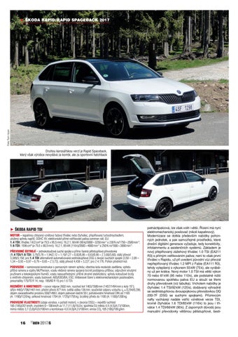 ► ŠKODA RAPID TDI MOTOR – kapalinou chlazený vznětový řadový tříválec nebo čtyřválec, přeplňovaný turbodmychadlem, uložený vpředu napříč; DOHC 4V; elektronické přímé vstřikování paliva common rail; EU; 1.4 TDI: tříválec 1422 cm3 (ø 79,5 x 95,5 mm); 16,2:1; 66 kW (90 k)/3000 – 3250 min‑1 a 230 N.m/1750 – 2500 min‑1; 1.6 TDI: 1596 cm3 (ø 79,5 x 80,5 mm); 16,2:1; 85 kW (116 k)/3500 – 4000 min‑1 a 250 N.m/1500 – 3000 min‑1. PŘEVODNÉ ÚSTROJÍ – jednokotoučová suchá spojka a přímo řazená pětistupňová převodovka (1.4 TDI/1.6 TDI: 3,78/3,78 – 1,94/2,12 – 1,19/1,27 – 0,82/0,86 – 0,63/0,66 – Z 3,60/3,60), stálý převod 3,389/3,158; pro 1.4 TDI alternativně automatizovaná sedmistupňová DSG s dvojicí suchých spojek (3,50 – 2,09 – 1,34 – 0,93 – 0,97 – 0,79 – 0,65 – Z 3,72), stálý převod 4,438 + 3,227, pro Z 4,176. Pohon předních kol. PODVOZEK – samonosná konstrukce s pomocným rámem vpředu; všechna kola nezávisle zavěšena, vpředu příčná ramena a vzpěry McPherson, vzadu vlečená ramena spojená torzně poddajnou příčkou; odpružení vinutými pružinami a teleskopickými tlumiči, vzadu nesoustřednými; příčné zkrutné stabilizátory; vpředu kotoučové brzdy s vnitřním chlazením, vzadu bubnové; ABS/EBD/BA, ESC; hřebenové řízení s elektromechanickým posilovačem, pneumatiky 175/70 R 14, resp. 185/60 R 15 pro 1.6 TDI. ROZMĚRY A HMOTNOSTI – rozvor náprav 2602 mm, rozchod kol 1463/1500 mm (1457/1494 mm s koly 15“); d/š/v 4483/1706/1461 mm; přední převis 877 mm; světlá výška 136 mm; součinitel odporu vzduchu cx = 0,294/0,296; objem zavazadlového prostoru 550/1490 l; objem palivové nádrže 55 l; pohotovostní hmotnost DIN od 1169 (A: 1190)/1220 kg; celková hmotnost 1704 (A: 1725)/1755 kg; brzděný přívěs do 1100 (A: 1100)/1200 kg. PROVOZNÍ VLASTNOSTI (údaje výrobce, v pořadí motorů, v závorce DSG) – největší rychlost 185 (185)/201 km/h; zrychlení 0 – 100 km/h za 11,7 (11,8)/10,0 s; spotřeba EU město 4,4 (4,5)/4,7 l/100 km, mimo město 3,7 (3,8)/4,0 l/100 km a kombinace 4,0 (4,0)/4,2 l/100 km; emise CO2 105 (106)/109 g/km.