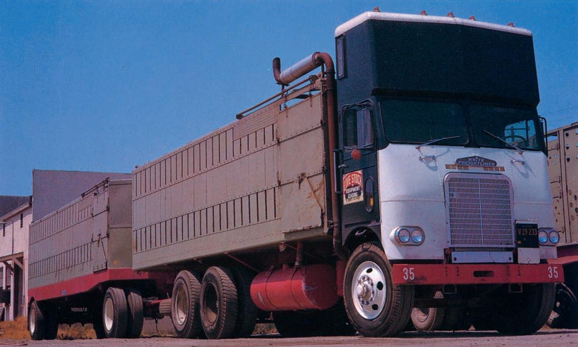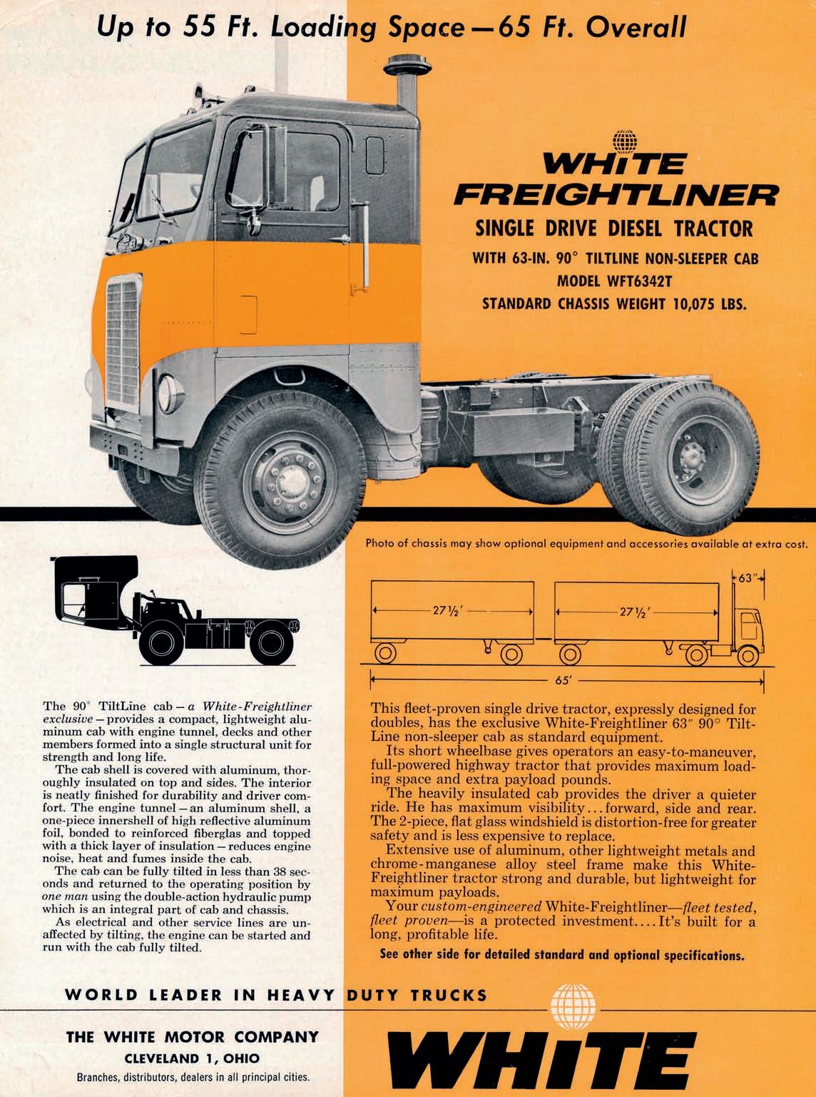 1 White-Freightliner Cabover ze šedesátých let s krátkou budkou a spací nástavbou jako cattle-truck (pro přepravu živých zvířat) 2 V roce 1974 vyjely první vozy White-Freightliner WFT-8164 Conventional s kapotovou budkou (do té doby to byly jen trambusové Cabovery) 3 White-Freightliner Powerliner, jeden z posledních společných typů, představený pro dálkovou dopravu v roce 1974 (motory až 441 kW/600 k)