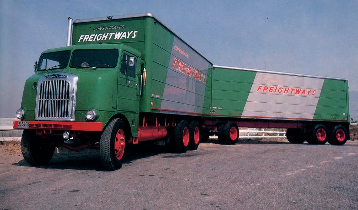 v roce 1942, vždy sázel na tuto koncepci, pro niž jako první ve velké míře využil hliníkových slitin. Do roku 1949 byla jeho firma Consolidated Freightways jediným klientem Freightlineru, než výrobce stavebních strojů Hyster zakoupil legendární tahač, dnes známý jako Hyster No.1, který se proslavil ujetím čtyř milionů mil (6,4 milionu kilometrů), byl roku 1976 renovován a dnes je významným exponátem národních sbírek Smithsonian Museum of History & Technology ve Washingtonu (DC). V roce 1951 uzavřel Freightliner dohodu o spolupráci s významným výrobcem nákladních vozů White, která zahrnovala výrobu, prodej a další vývoj pod společnou značkou White-Freightliner, přičemž nadále pokračovala výroba vlastních typů White a automobilů dalších zakoupených značek Autocar, Sterling, Diamond T a REO (později Diamond-Reo). První konstrukce Consolidated Freightways (CF) nesla označení CF-100, vznikla v roce 1937 s bezkapotovou budkou (Cabover), využitím podvozku Fageol a vznětového šestiválce Cummins. Do nuceného zastavení produkce pro přechod na válečný program v roce 1942 vzniklo několik desítek vozů, přičemž poprvé se značka Freight-Liner objevila už v roce 1940. První vozy měly jednoduché budky hranatých tvarů, na rok 1942 však už byl připraven Freightliner se zaoblenou trambusovou budkou, jenž se stal základem poválečných typů WF 800, jejichž výhradní prodej převzala White Motor Company. Proti Consolidated Freightways ovšem vystoupil