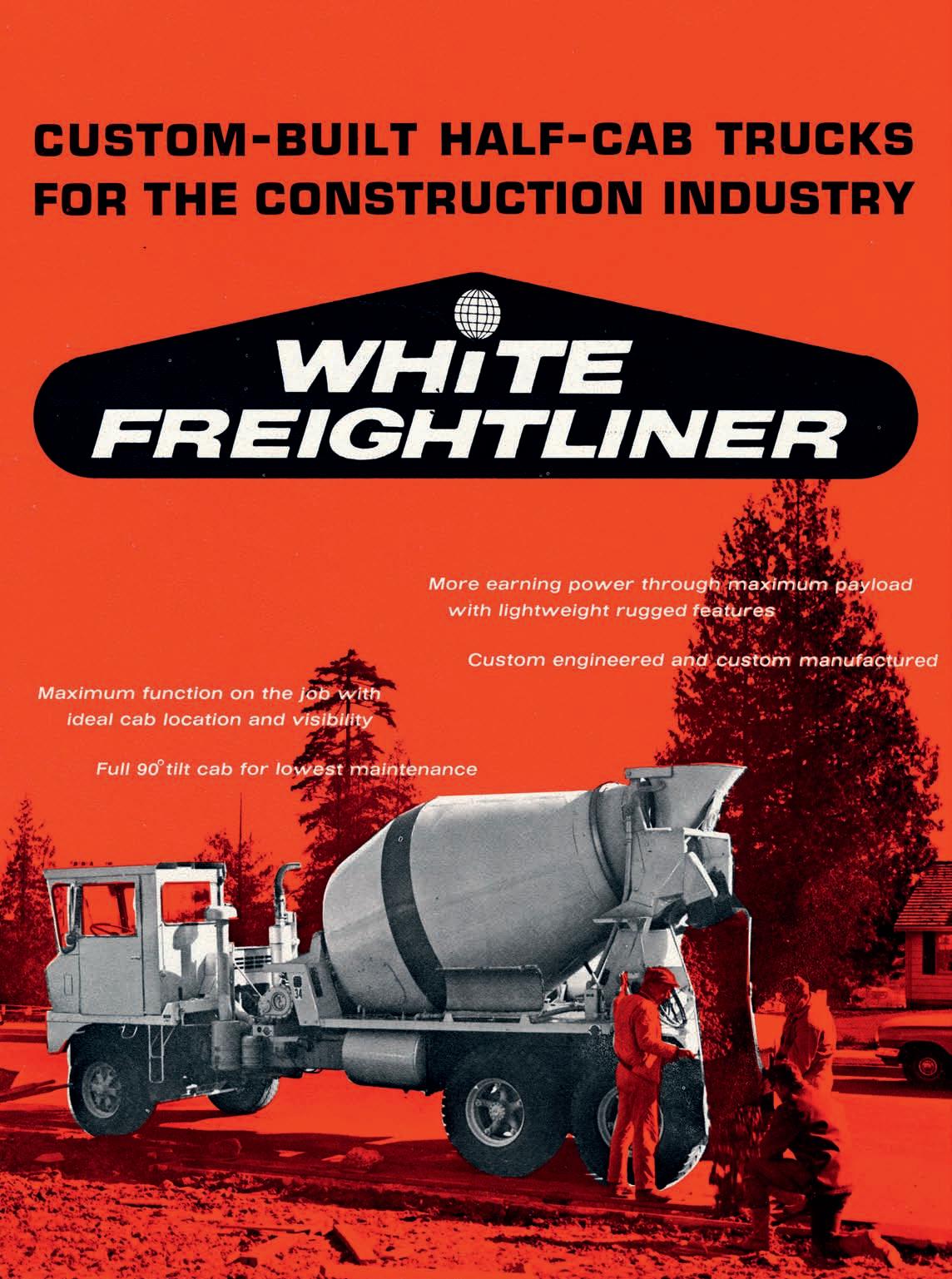1 Značka White-Freightliner se používala do roku 1976, pak se vozy vrátily jen ke Freightlineru (na snímku vysloužilý Conventional) 2 V roce 1948 reklama zdůrazňovala lehkou stavbu; vedle vznětových motorů Hercules a Cummins přišly ke slovu také diesely od The Buda Co. z Harvey (Illinois) 3, 4 Rovněž WFHT-6264 Half-Cab pro stavebnictví měl sklopnou budku, a to až o 90° vpřed pro snazší přístup k motoru (1965) 5 Originální Half-Cab sloužil především jako domíchávač betonu, ale rovněž sklápěč nebo podvozek pro zvláštní nástavby