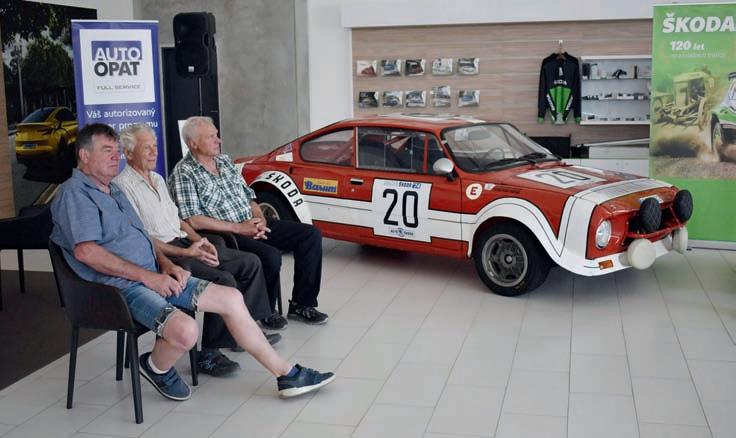 1 Představení nové knihy ve showroomu Auto Opat v Nupakách (zleva Ladislav Křeček, Oldřich Horsák, autor Petr Dufek a Milan Zapadlo) 2 Vystavená legenda Škoda 200 RS, renovovaná Stanislavem Kafkou sr, a trojice neméně slavných závodníků (zleva Milan Zapadlo, Oldřich Horsák a Ladislav Křeček) 3 Milan Zapadlo odpovídá na otázky Vladimíra Dolejše, moderátora tiskové konference, známého z dlouholetého působení v Auto-Moto-Revue ČT 4 Ladislav Křeček se ujal slova, vpravo přihlíží Oldřich Horsák, dlouholetý tovární jezdec AZNP Škoda