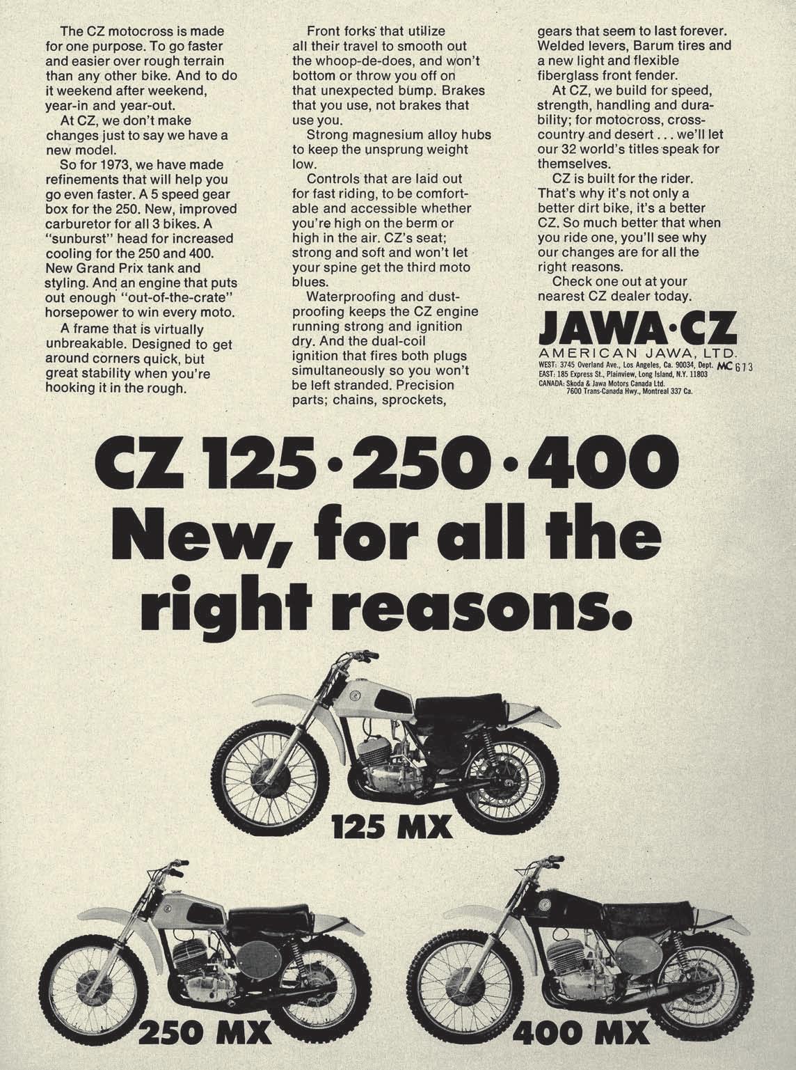 Toto není placená inzerce, ale ukázka reklamy na motokrosové motocykly ČZ, nabízené firmou AMERICAN JAWA v USA (1973)