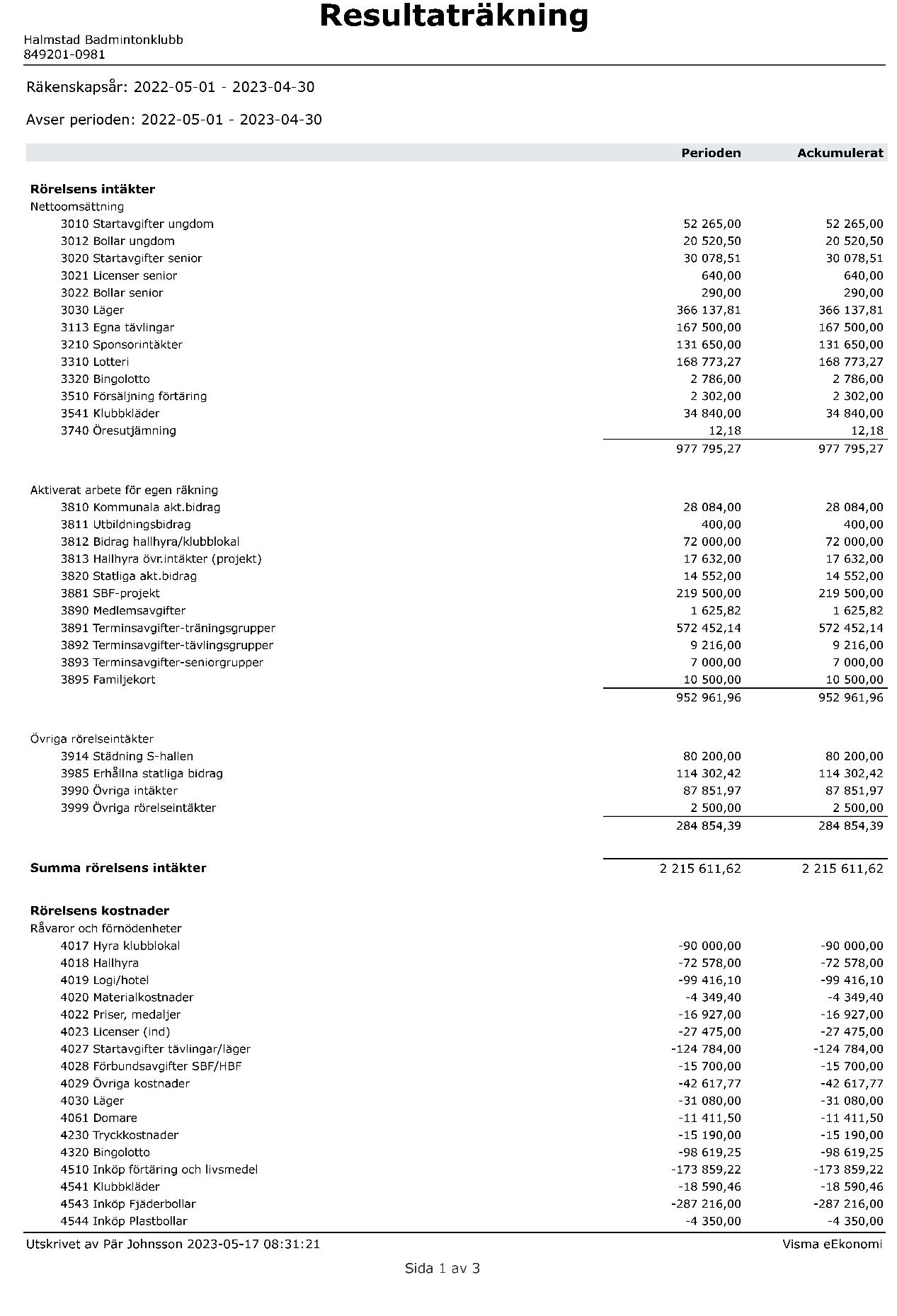 Undertecknad utsedd revisor för Halmstad Badmintonklubb får efter fullgjort uppdrag avgiva följande revisionsberättelse för verksamhetsåret 220501-230430.