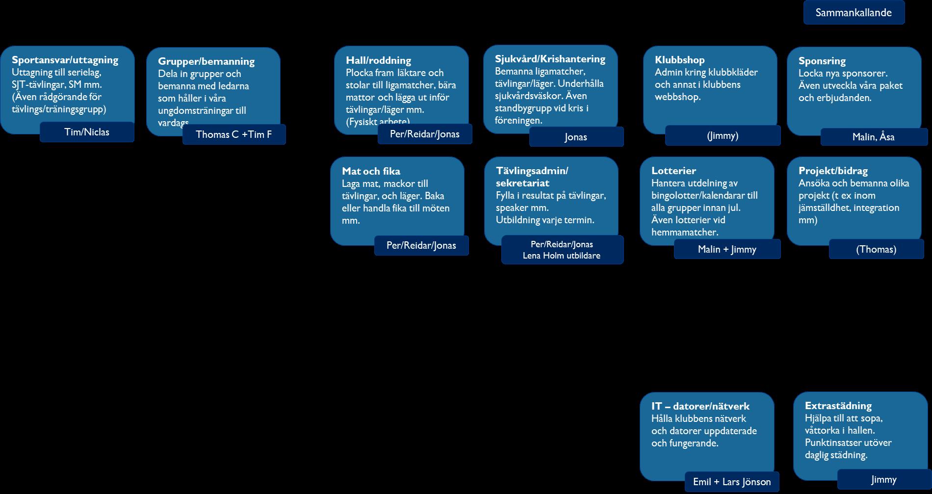 Under varje kommitté finns grupper i vilka man kan engagera sig för exempelvis domaruppdrag, tävlingsarrangemang eller matlagning.