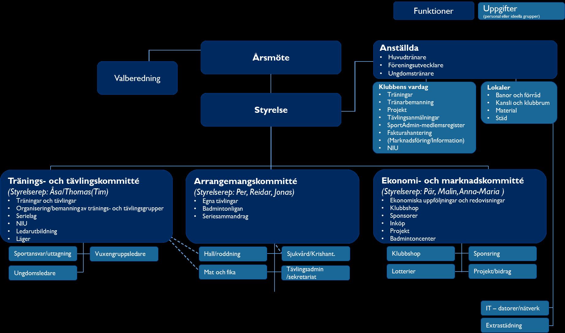 Föreningens organisationsmodell syftar till att minska individberoendet och göra det enklare för varje ideell resurs att se var man passar in i föreningen. Organisationen bygger på tre kommittéer, som rapporterar till styrelsen.