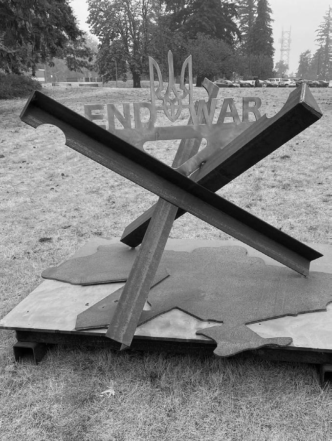 At the UFV Chilliwack campus there are two large antiwar symbols in the form of large hedgehog sculptures on display to help raise awareness about the current Ukraine conflict with Russia, and to promote peace. The original steel hedgehog sculpture was created by Maciej Kaczor, program technician from the faculty of applied and technical studies, welding instructor Matt Olafson, and several students. The antiwar statue is made up of large steel beams that are protectively placed over a map of Ukraine. The words “End War” are mounted on the very top of the sculpture in clear letters.