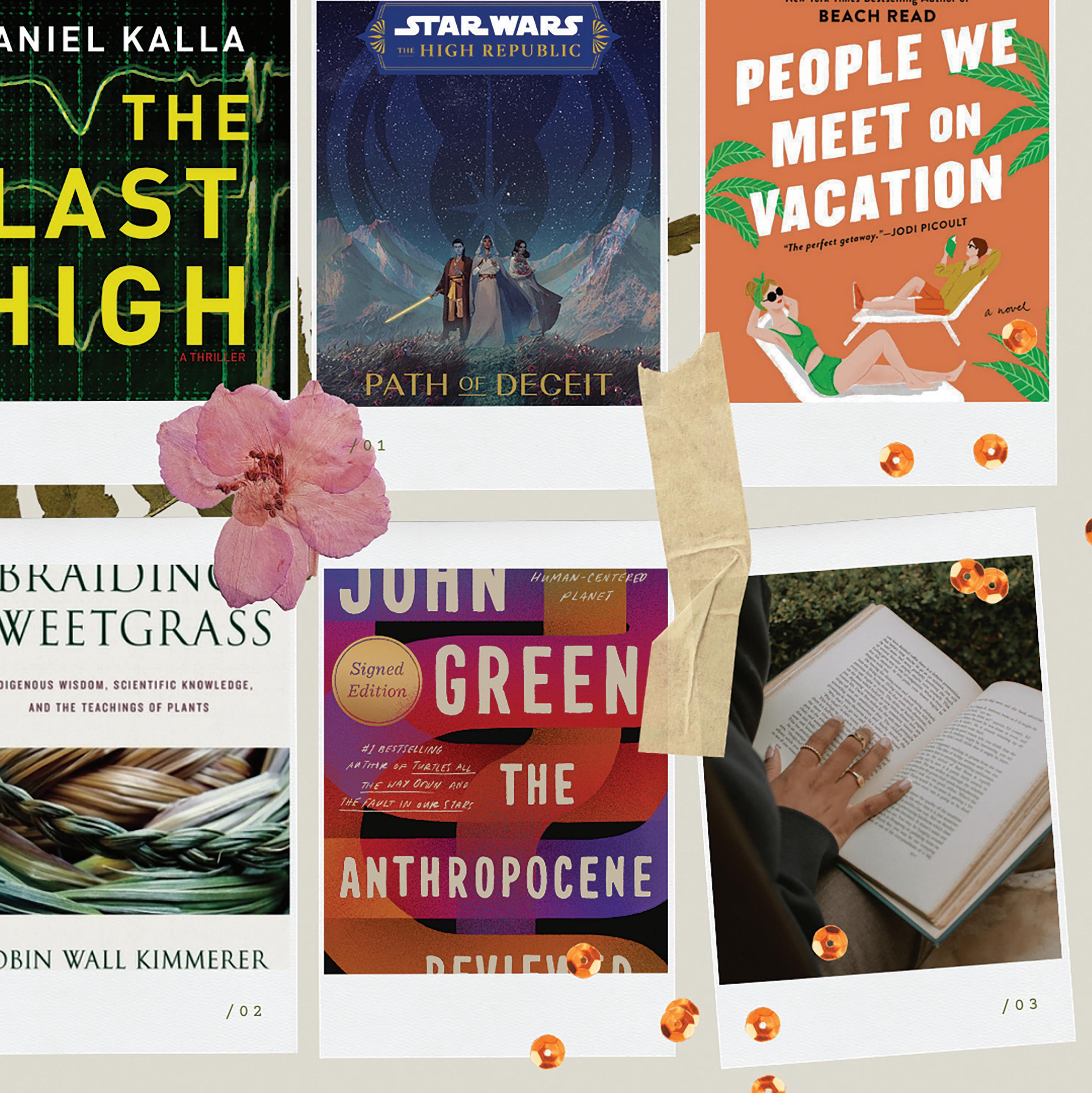 Book covers of The Last High by Daniel Kalla, Path of Deceit by Tessa Gratton and Justina Ireland, People We Meet on Vacation by Emily Henry, Braiding Sweetgrass by Robin Wall Kimmerer, The Anthropocene Reviewed by John Green.” (Graphic by Gabriela Gonzalez / The Cascade)