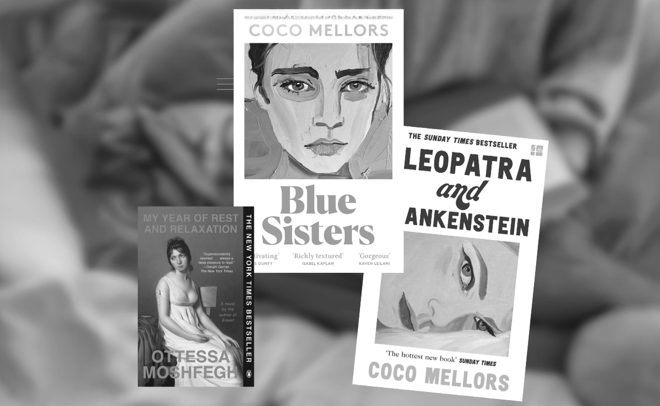 Graphic by Gabriela Gonzalez / Book covers of Cleopatra and Frankenstein (2022) and Blue Sisters (2024) by Coco Mellors, and My Year of Rest and Relaxation (2018) by Ottessa Moshfegh.