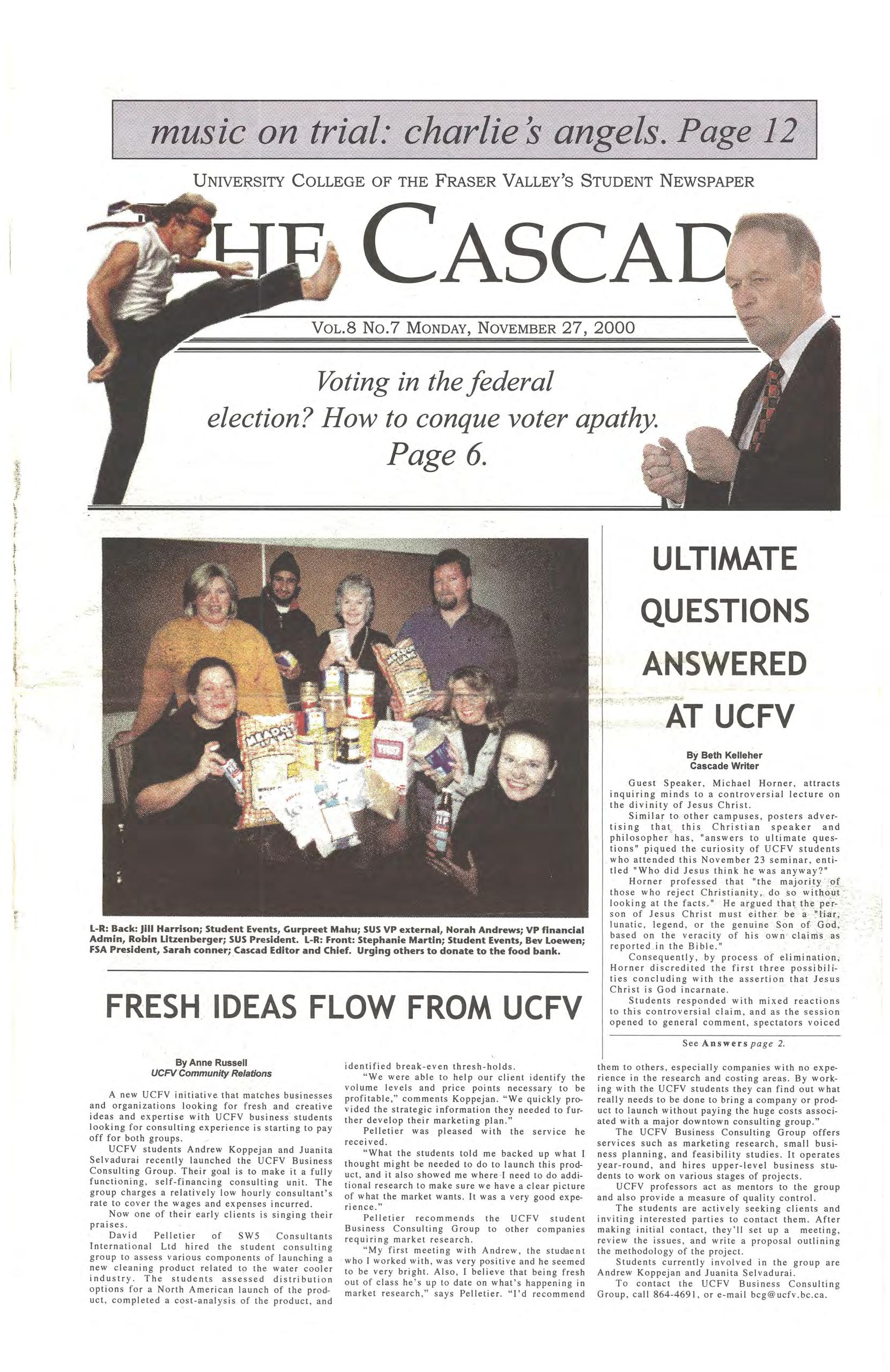 Similar to ·other campuses, posters advertising that. this Christian speaker and phil-osopher ·has, "answers to ultimate questions" piqued the curiosity of UCFV students who attended this November 23 seminar, entitled "Who did Jesus think he was anyway?"