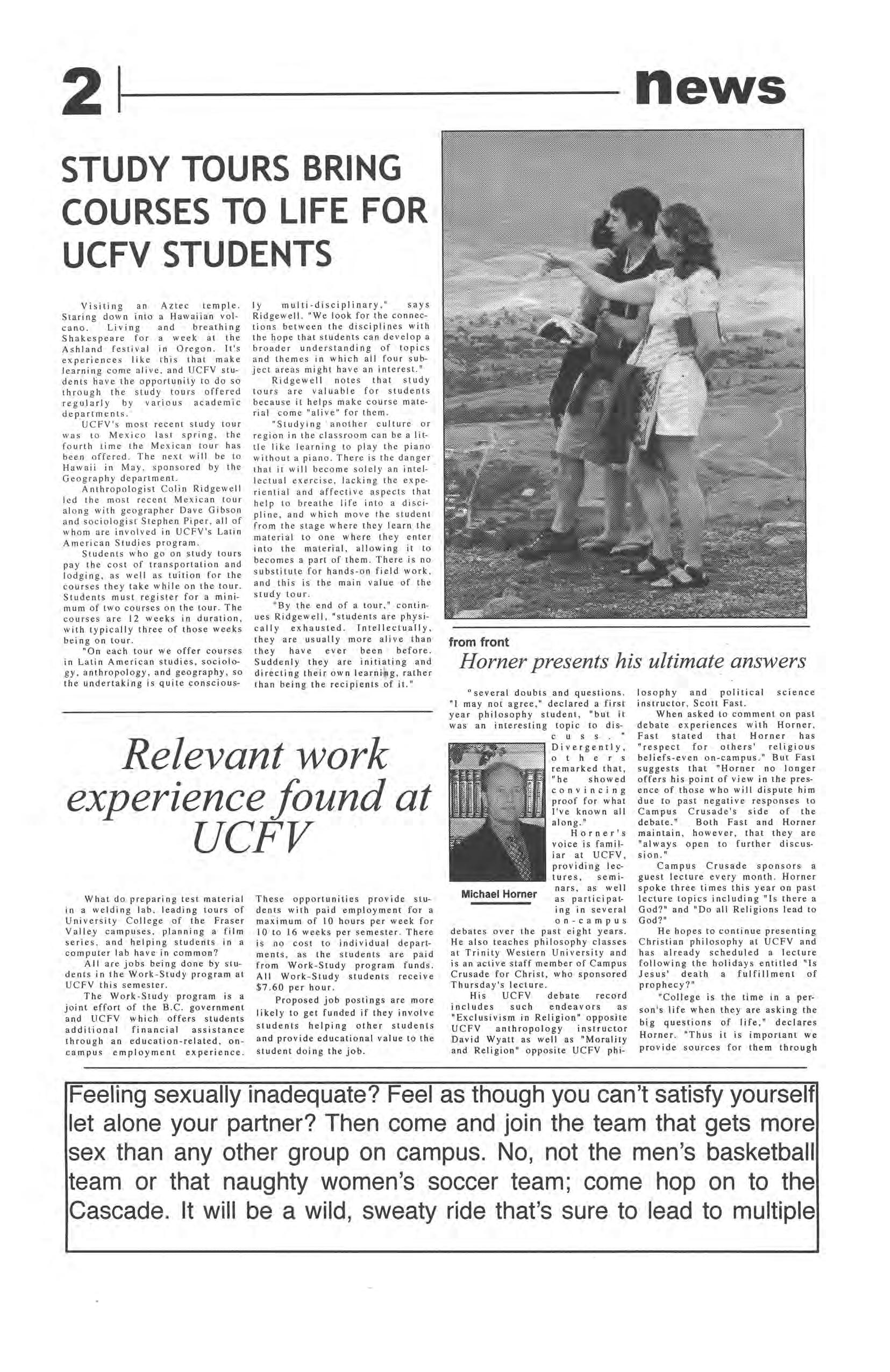 Horner's voice is familiar at UCFV, providing lectures, seminars, as well as participating in several on-campus debates over the past eight years. He also teaches philos·ophy classes at Trinity Western University and is an active staff member of Campus Crusade for Christ, who sponsored Thursday's lecture.