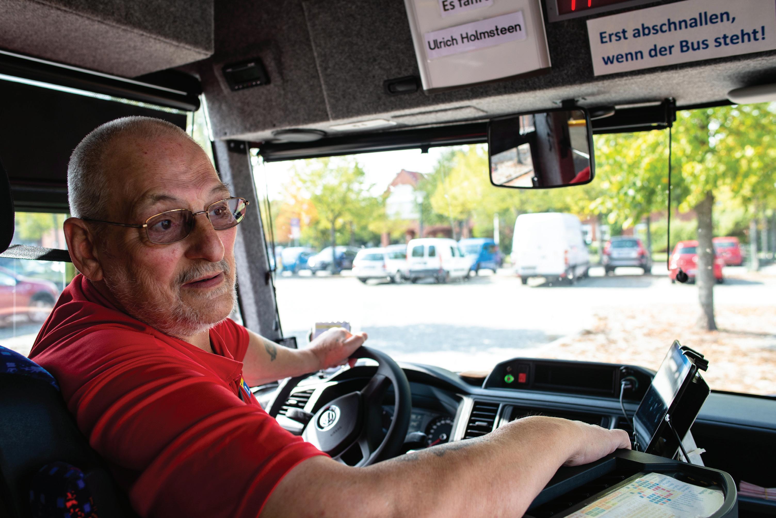 Ulrich Holmsteen uses the waiting time to do a spot of sunbathing: the autumn rays reach his face through the driver’s side window, which is wound down. Holmsteen smiles, his eyes half-closed. He’ll wait another moment or two, in case there’s another passenger who wants to get on board. Then a woman gets on his bus. Holmsteen opens his eyes and starts the engine after the woman has sat down. “I’m glad it’s started — I just love driving,” he says.